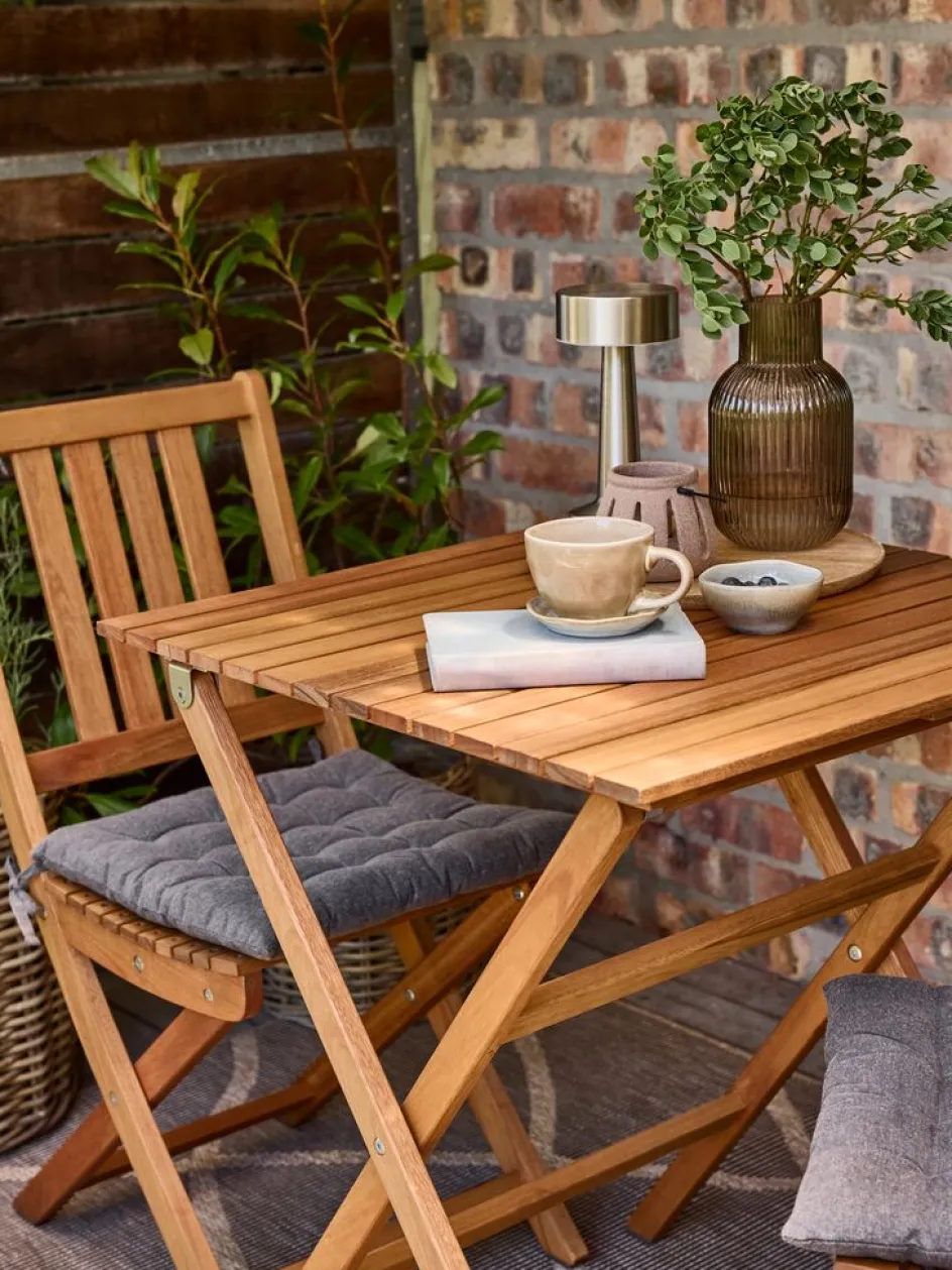 Table bistrot en bois dur FSC® huilé. La table peut être pliée à plat et rangée facilement. Le bois durable est traité avec de l’huile afin de le protéger et de rehausser sa couleur naturelle. L’huilage régulier du bois est recommandé pour préserver sa couleur et le protéger de l’humidité. l62 x L62 x H74 cm