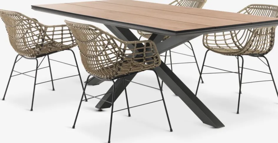 Ensemble meubles de jardin 4 places. Table: Aluminium et bois composite DURAWOOD®. DURAWOOD® est un matériau composite durable en fibres de bois dur FSC® et plastique. l100 x L215 x H75 cm. Chaise: Acier et polyrotin.