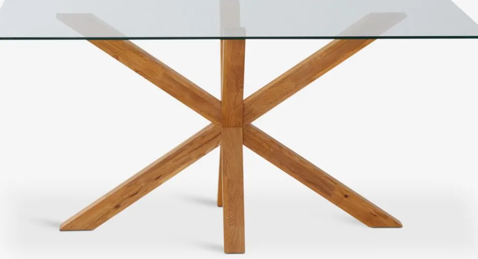Table de salle à manger avec plateau de table en verre trempé et pieds en chêne massif. Le bois est traité à l’huile pour le protéger et mettre en valeur sa couleur naturelle. l90 x L160 x H75 cm