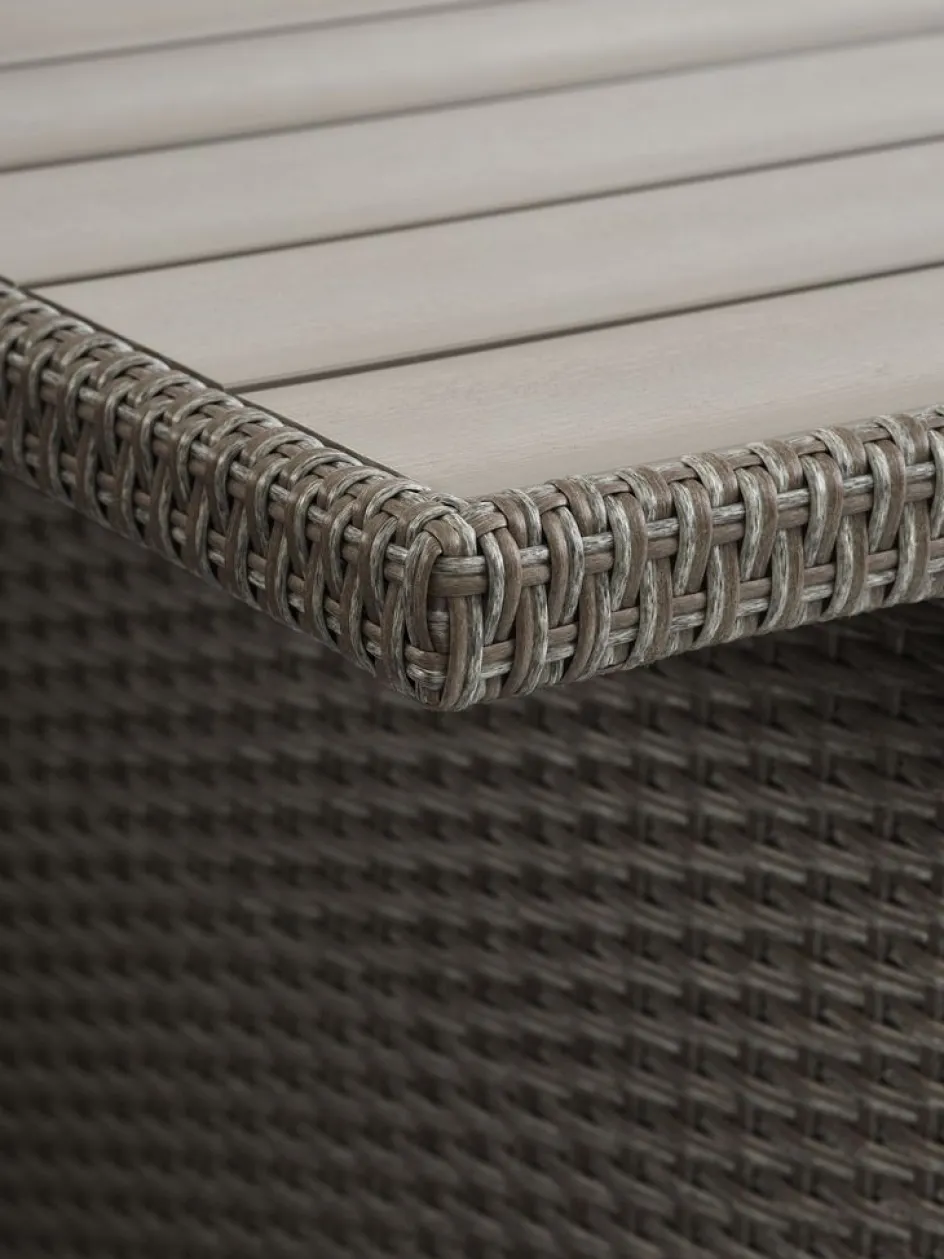 La table lounge est dotée d’un plateau en bois artificiel. Elle présente l’aspect et la texture du bois naturel sans nécessiter d’entretien. Elle est fabriquée à partir de plastique, tel que le polystyrène, qui constitue un matériau durable. Le bois artificiel, ou imitation bois, résiste aux intempéries, ce qui signifie qu’il peut supporter l’exposition au soleil, à l’humidité et aux changements de température. Évitez de placer des objets en verre directement exposés au soleil sur le bois artificiel, car cela pourrait causer des traces de brûlure et une décoloration.