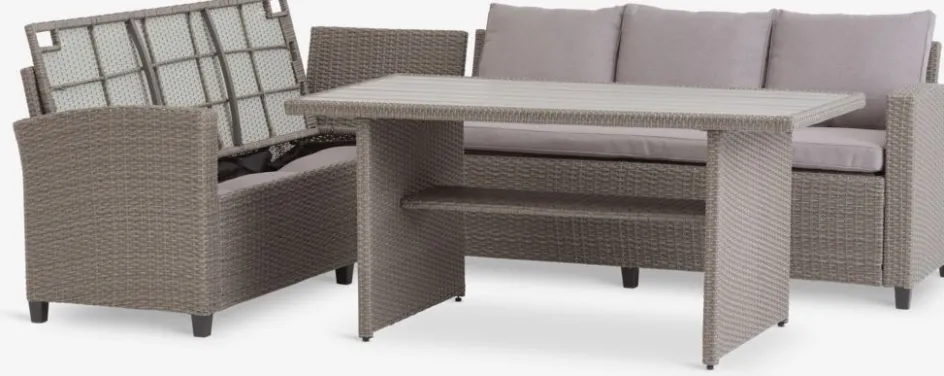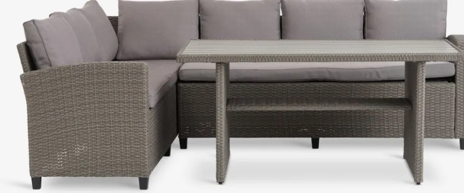 Passez du bon temps dans votre espace extérieur avec l’ensemble lounge AGERMOSE. Cet ensemble de jardin 6 places se compose d’un canapé d’angle avec des coussins confortables, ainsi que d’une table louge assortie avec un plateau en bois artificiel. Le canapé lounge dispose d’un espace de rangement pratique sous l’assise.