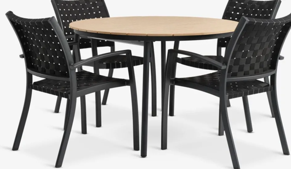 Ensemble meubles de jardin 4 places. Table: Aluminium, acier et imitation bois. Ø118 x H75 cm. Incl. 1 rallonge pouvant être rangée sous le plateau. Dimensions avec rallonge: l118 x L168 x H75 cm. Chaise: Aluminium et polypropylène. Empilable.