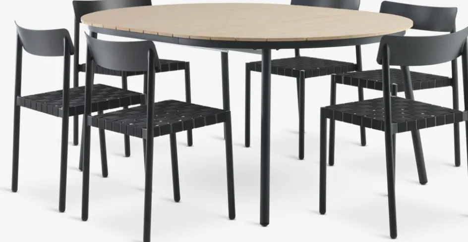 Ensemble meubles de jardin 4 places. Table: Aluminium, acier et imitation bois. Ø118 x H75 cm. Incl. 1 rallonge pouvant être rangée sous le plateau. Dimensions avec rallonge: l118 x L168 x H75 cm. Chaise: Aluminium et polyester. Empilable.