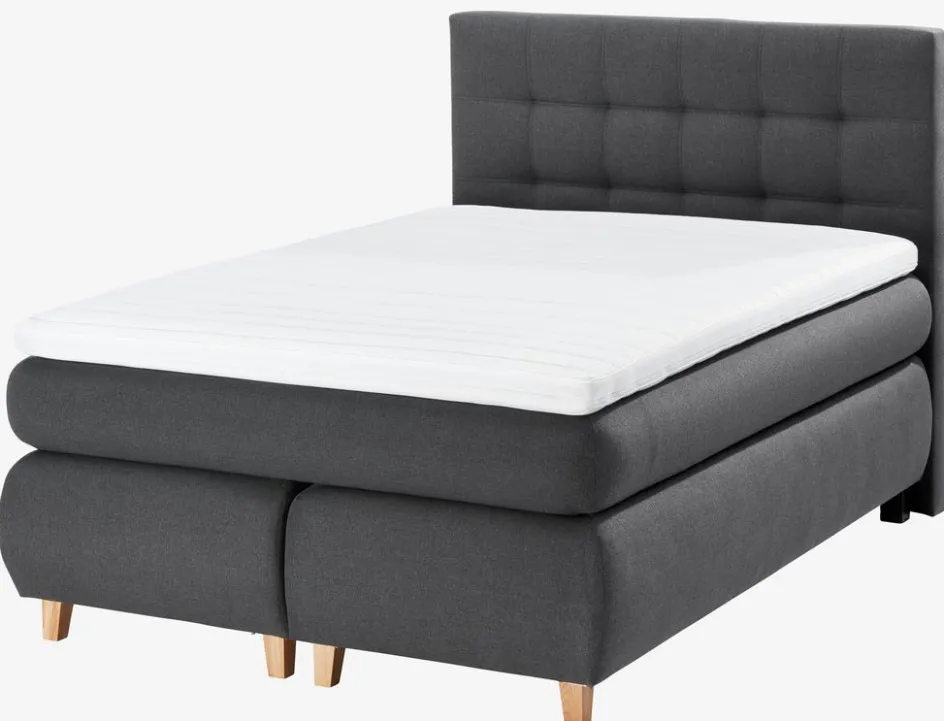 Sommier tapissier 140×200 cm. 1 matelas à ressorts réversible avec 240 ressorts ensachés/m², matelassé avec mousse polyéther. Le matelas est divisé en 7 zones de confort pour un soutien unique et ergonomique. 1 surmatelas, 7 cm d’épaisseur avec noyau en mousse à mémoire de forme qui soulage la pression et qui s’adapte aux contours du corps. Enveloppe lavable avec matelassage épais et doux. La base est composée de 2 sommiers tapissiers avec 120 ressorts bonnell/m². Incl. pieds. Excl. tête de lit.