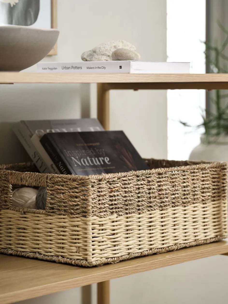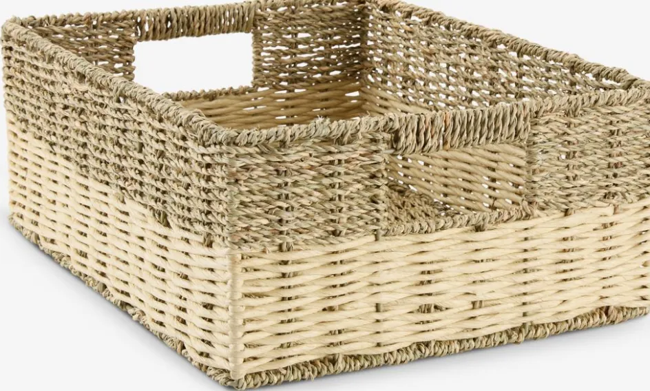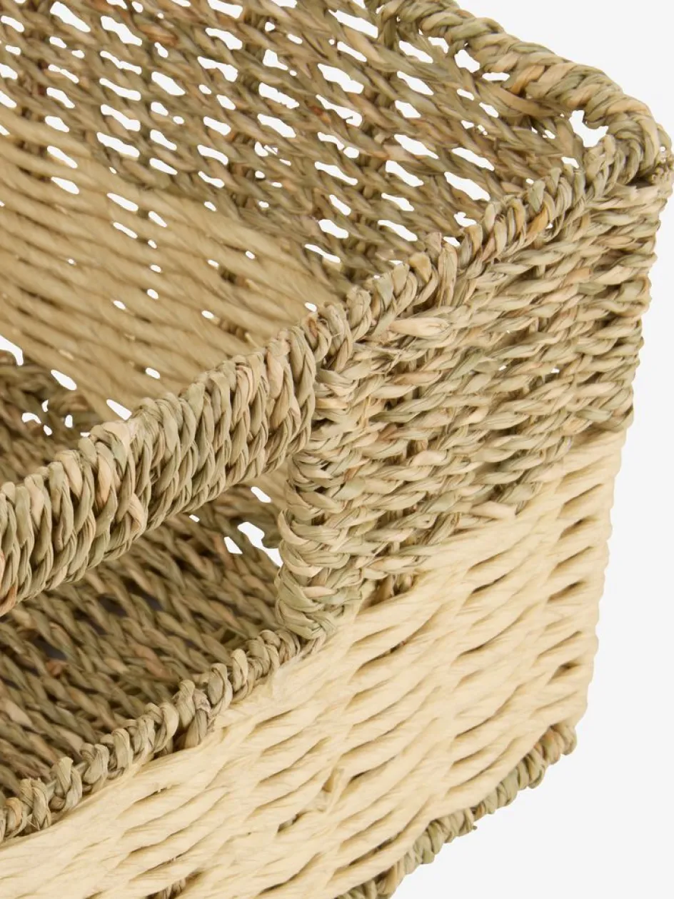 Panier en papier, herbier marin et acier inoxydable. Avec des poignées qui facilitent le déplacement. Une solution de rangement pratique et élégante pour les articles ménagers. l29 x L39 x H15 cm