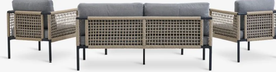 L’ensemble lounge BAMLE se compose d’un canapé lounge 2,5 places, de 2 fauteuils lounge et d’une table lounge. Le mobilier de salon assorti peu accueillir confortablement 4 à 5 personnes.