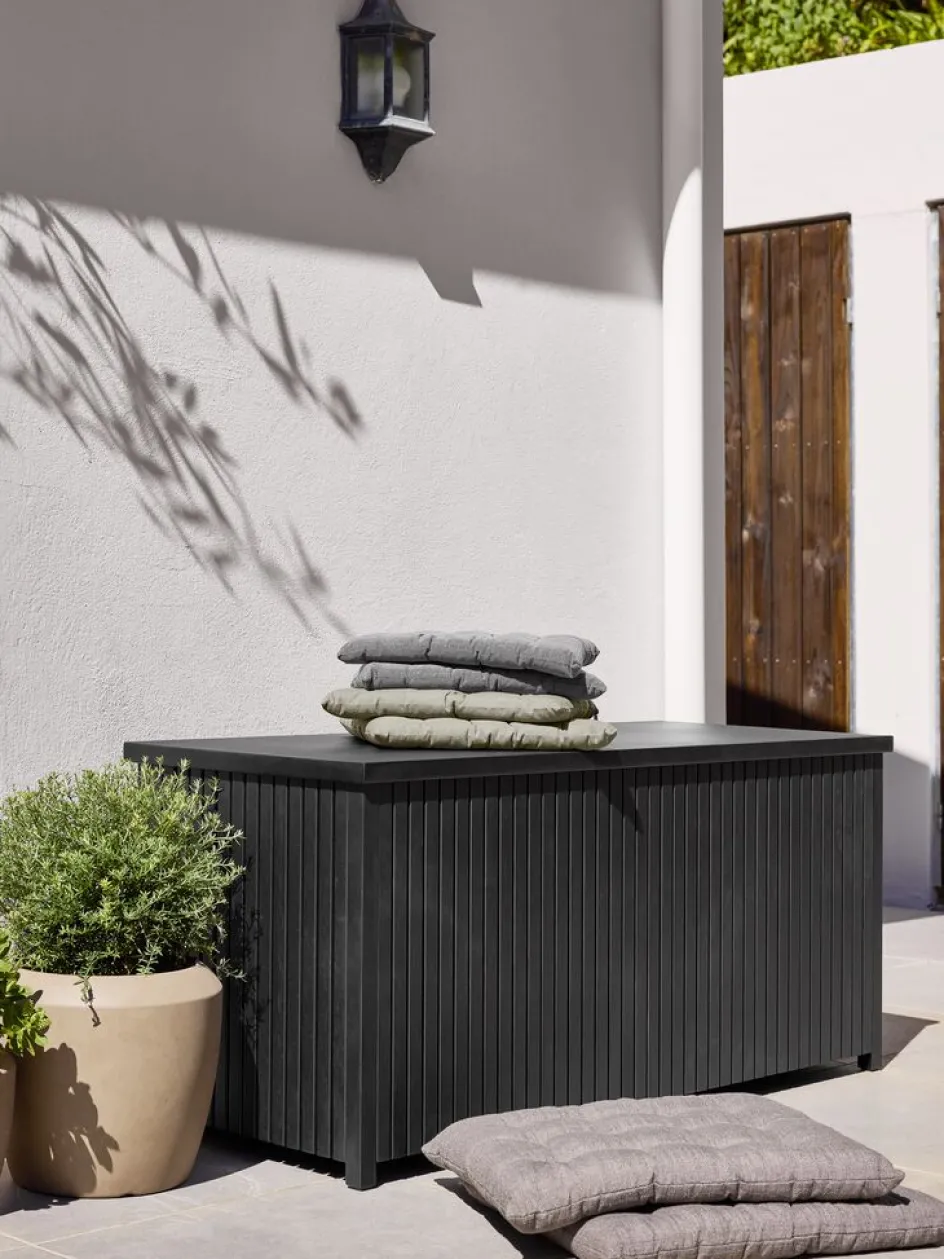 Coffre à coussins en bois FSC® vernis et acier galvanisé. Avec couvercle hydraulique facile à utiliser. l133 x H61 x P54 cm