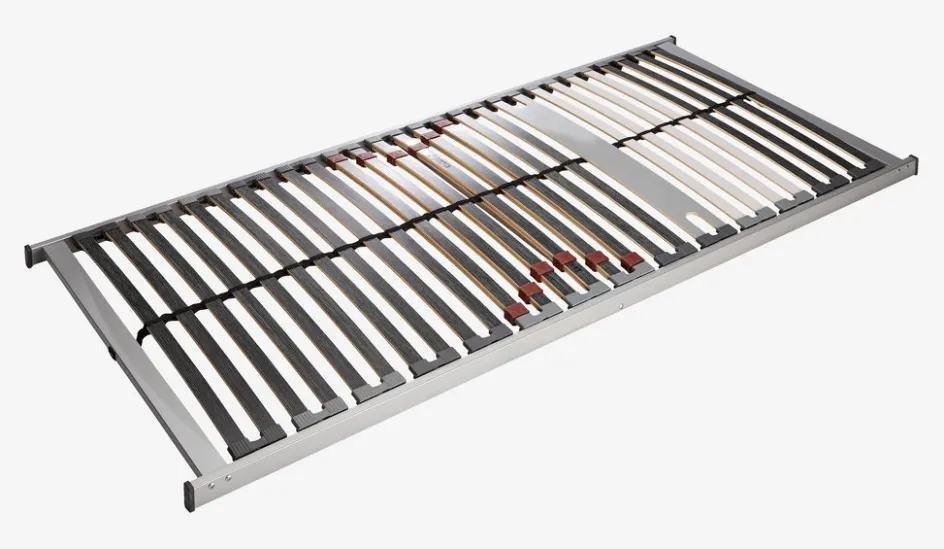 25 lattes en contreplaqué bouleau dont 5 lattes doubles ajustables. Traverses en hêtre massif. 7 zones de confort. Pour matelas 140×190 cm, l140 x L190 x H4,5 cm