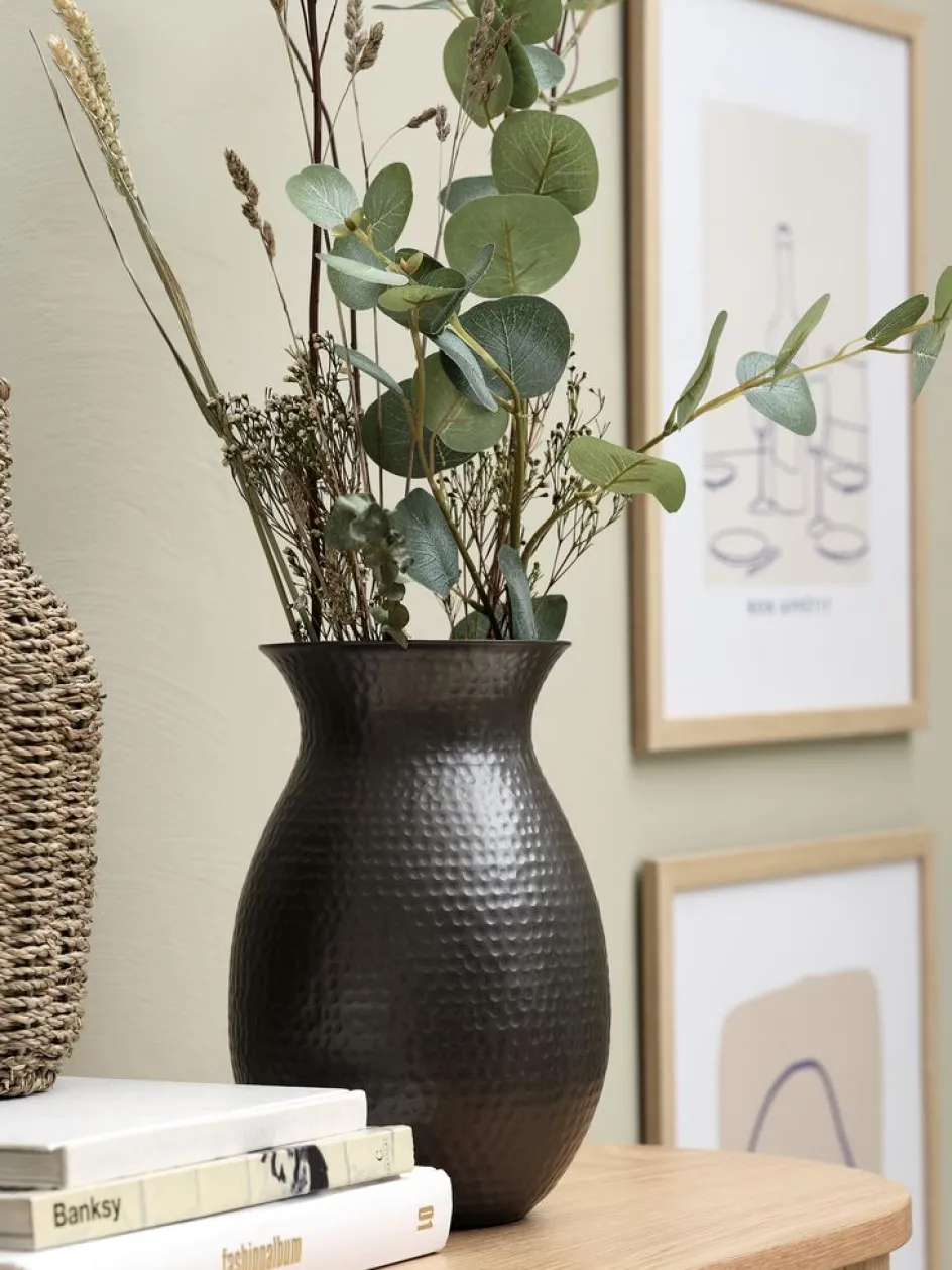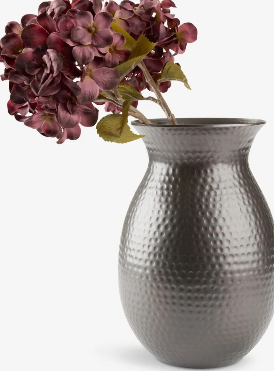 Vase brun en aluminium avec une forme incurvée. La texture martelée du vase lui donne un aspect unique. Ø15 x H27 cm