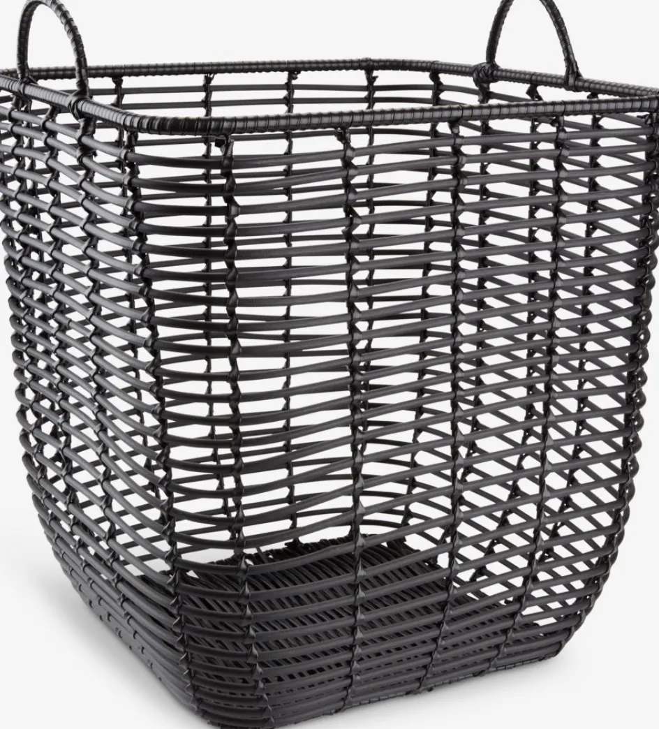 Panier noir au design tressé et spacieux, ce qui le rend adapté pour ranger des couvertures ou des coussins dans le salon. Les poignées le rendent facile à déplacer. l37 x L37 x H39 cm