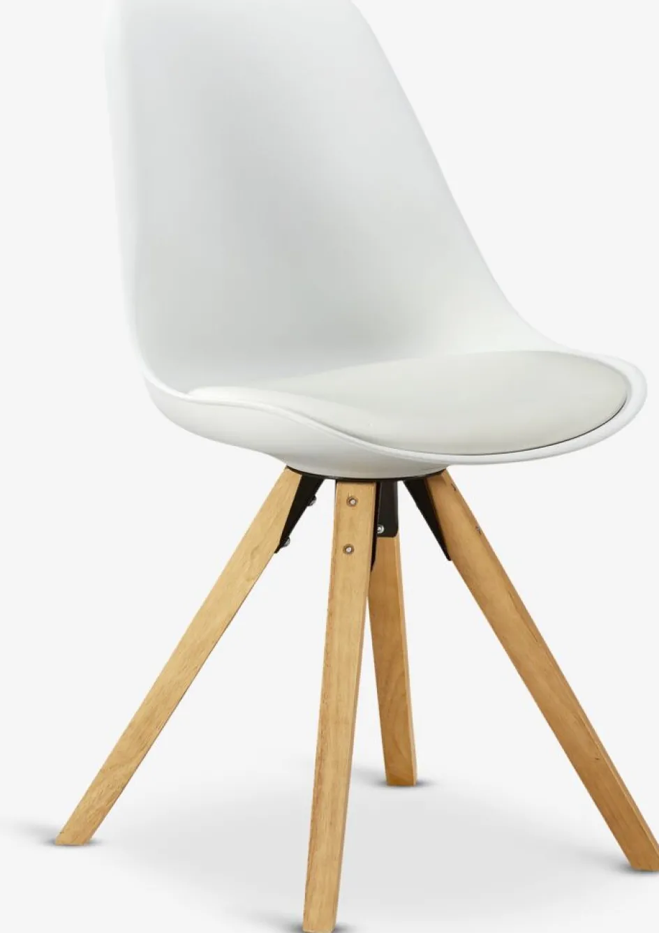 Chaise de salle à manger avec assise moulée blanche et coussin non amovible assorti. Pieds en bois massif.