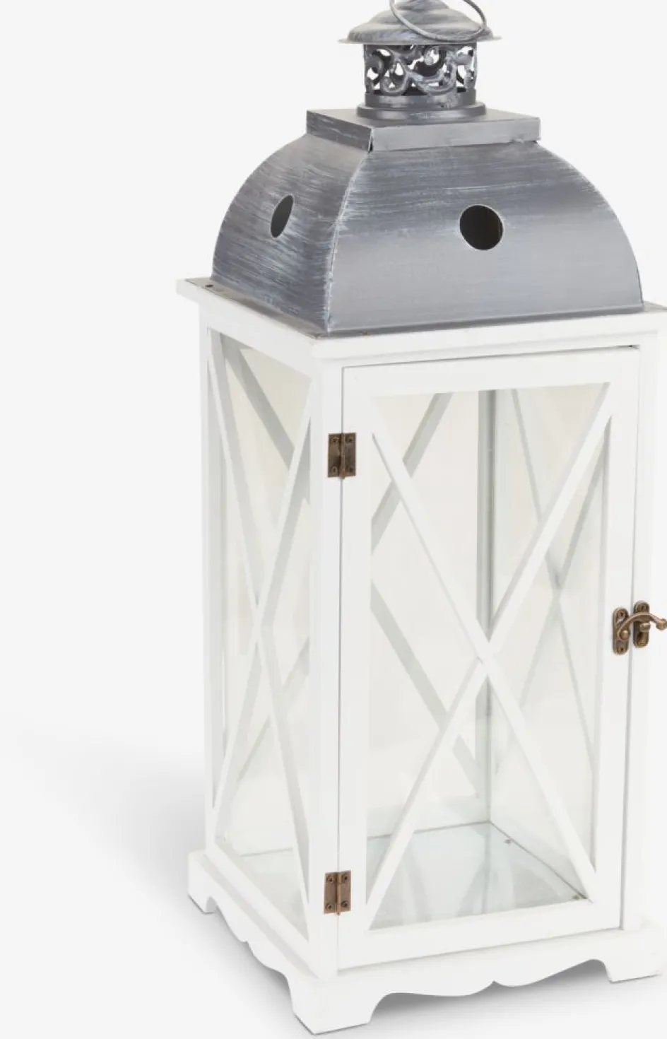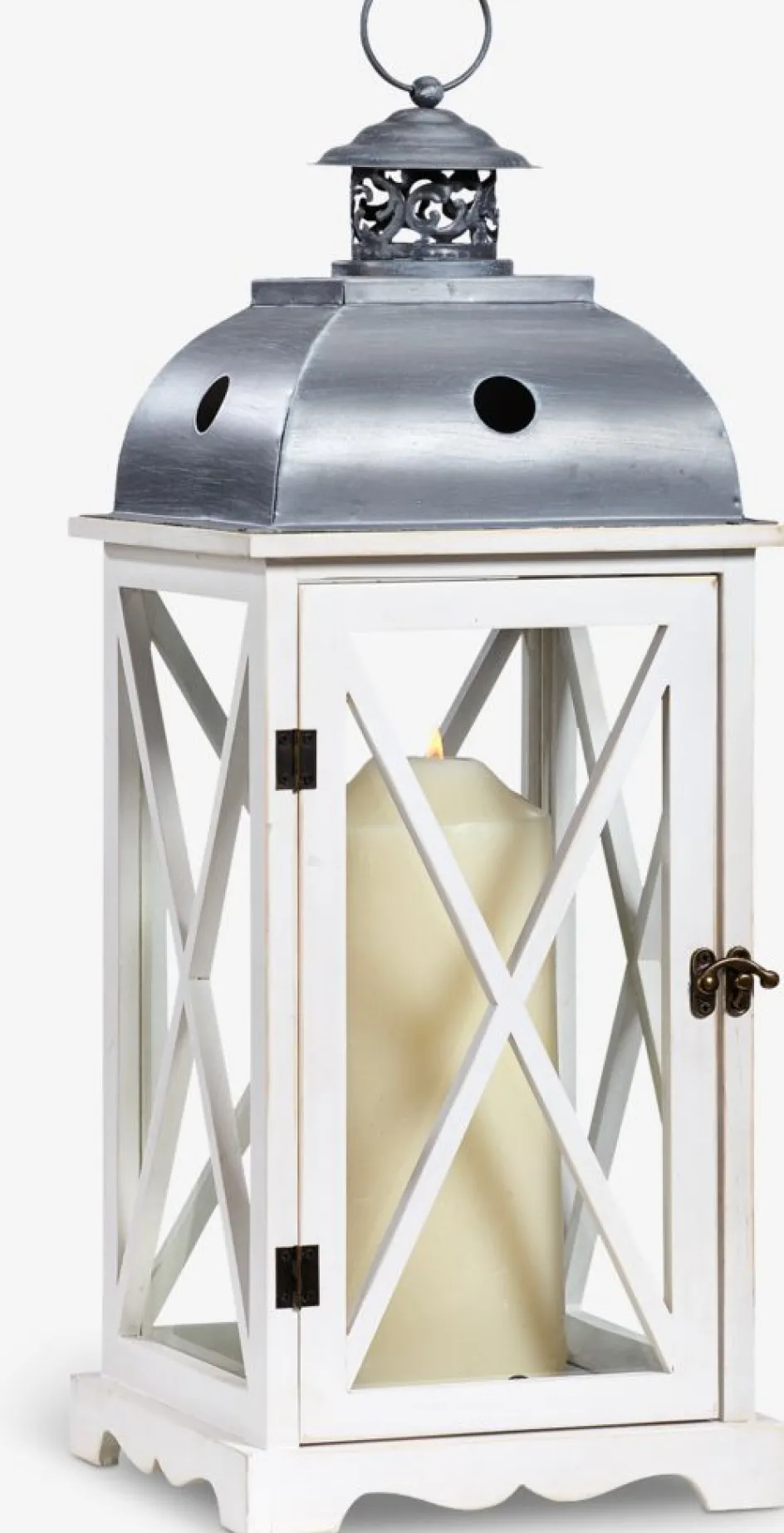 Cette lanterne présente un cadre blanc classique avec des panneaux en verre, complété par un couvercle décoratif en métal gris. Ouvrez l’un des côtés pour placer une bougie à l’intérieur de la lanterne et créer une atmosphère chaleureuse. l22 x L22 x H58 cm