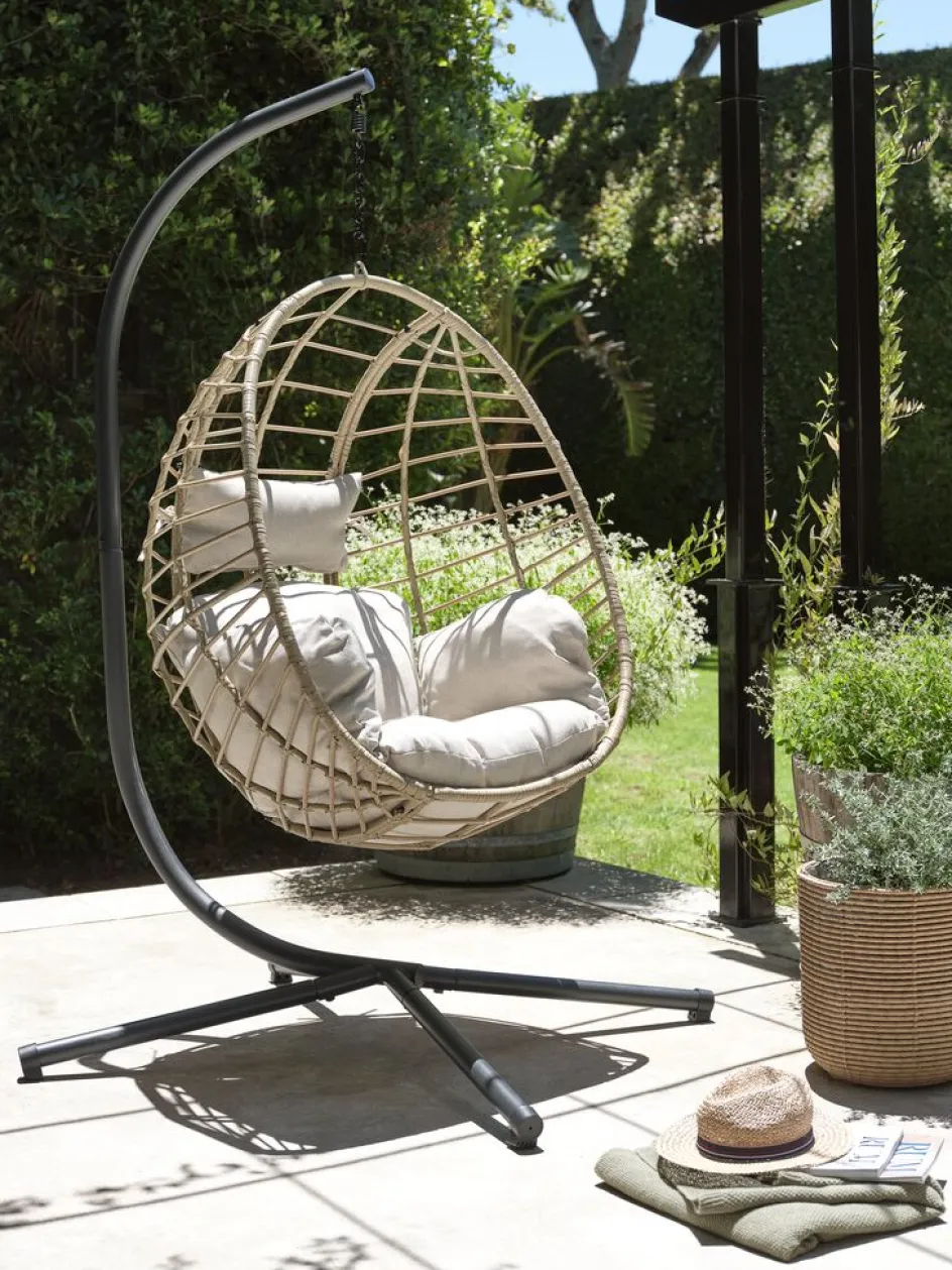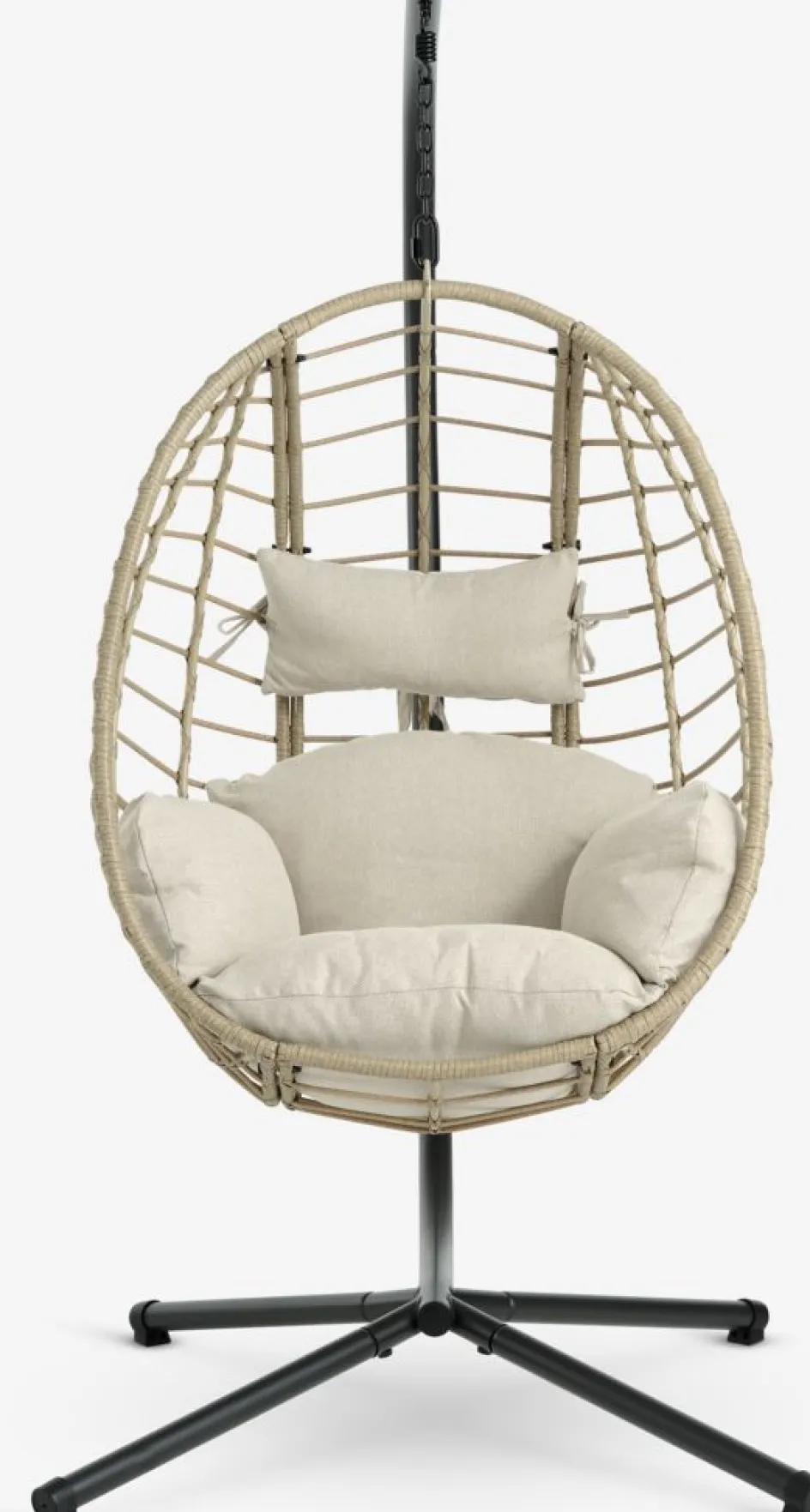 Chaise suspendue en acier et polyrotin. Incl. cadre et coussins haut de gamme avec housse résistante tissée. l96 x H192 x P124 cm