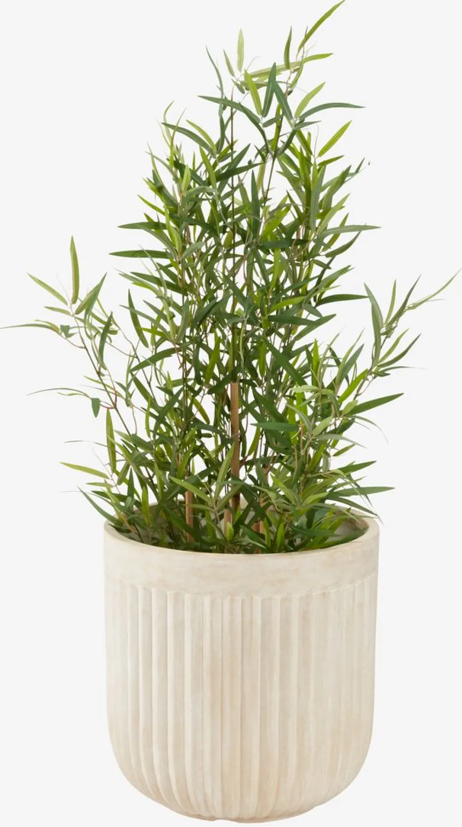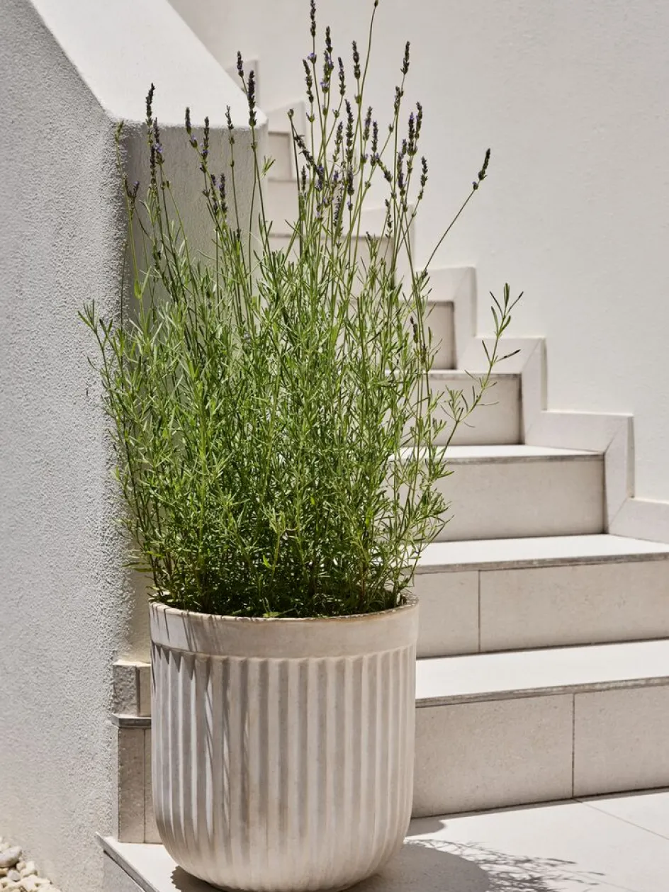Bac à fleurs en fibre d’argile résistant au gel avec une finition naturelle de couleur clair. Le trou de drainage permet à l’excès d’eau de s’écouler. Ø37 x H37 cm