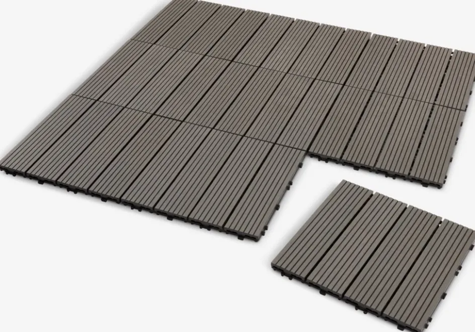 Dalles de terrasse brun foncé en imitation bois avec un support en plastique. Ces dalles sont faciles à installer, vous pouvez donc créer un sol extérieur élégant et confortable sur votre balcon ou dans votre serre en un rien de temps. Lot de 9 dalles. Chaque paquet couvre 0,81 m². l30 x L30 x H1,7 cm