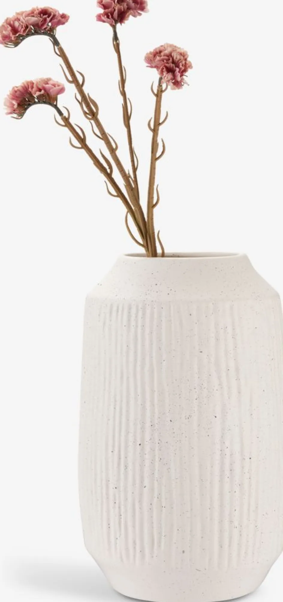Vase en dolomite blanc cassé à la texture côtelée verticale et à la finition mouchetée. Sa forme haute est idéale pour présenter de grands bouquets ou des branches, mais il est aussi magnifique seul comme pièce décorative. Ø21 x H33 cm