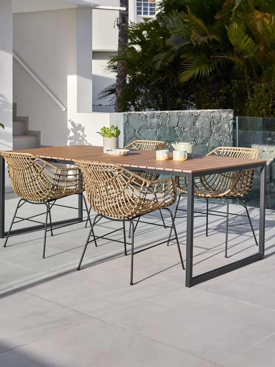 Ensemble meubles de jardin 4 places. Table: Aluminium, acier galvanisé et imitation bois. l90 x L190 x H74 cm. Chaise: Acier et polyrotin.
