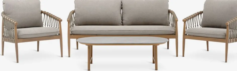 L’ensemble lounge d’extérieur est fabriqué à partir de matériaux durables et de qualité qui ne nécessitent aucun entretien. Il suffit de nettoyer le meuble avec de l’eau et un savon doux.