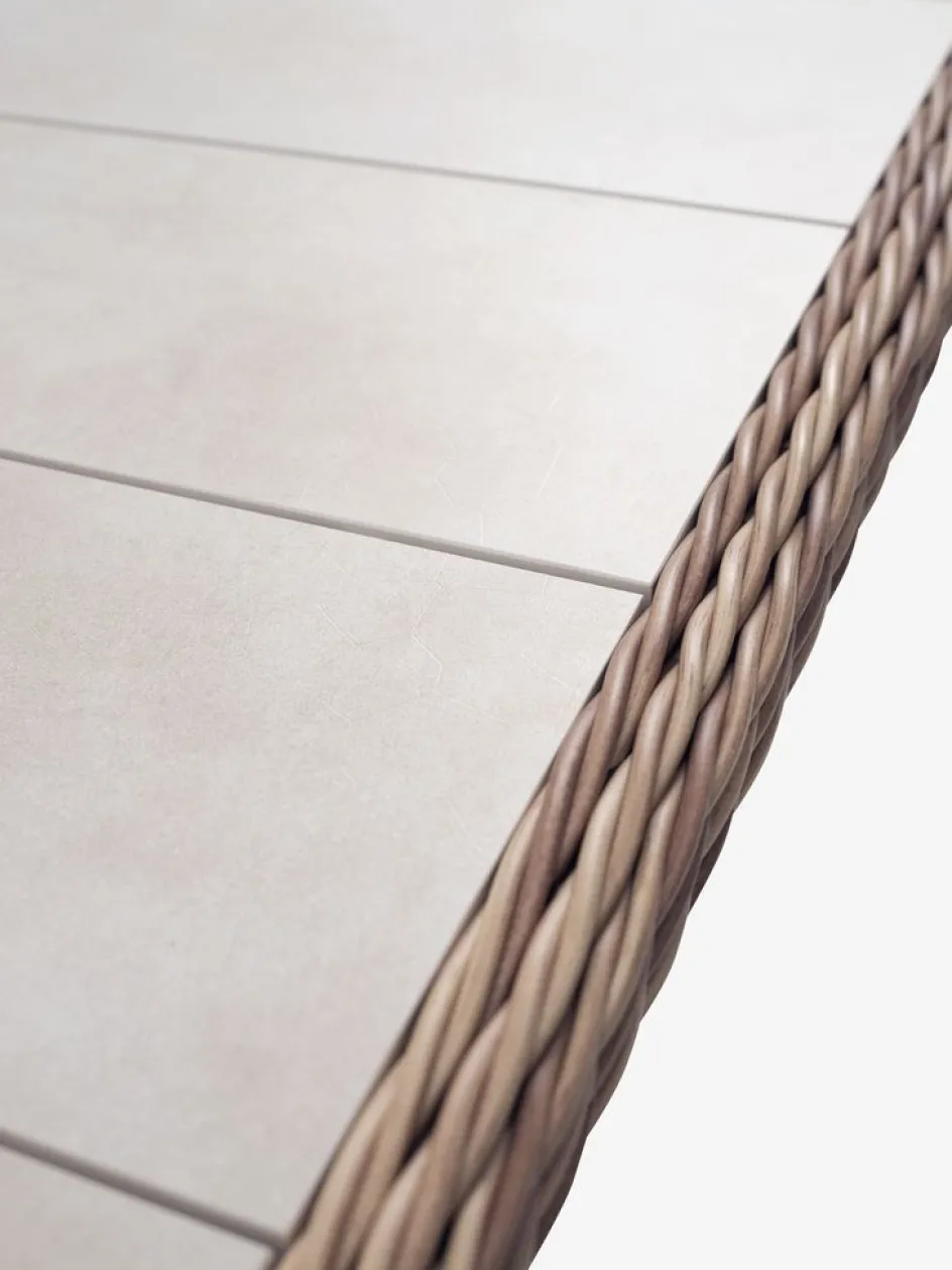 Le plateau de la table lounge est en céramique. Il s’agit d’un matériau durable qui résiste aux rayures, aux taches et à la chaleur. Par exemple, vous pouvez poser des casseroles et des poêles chaudes directement sur la surface. La céramique résiste aux intempéries, ce qui signifie qu’elle peut supporter l’exposition au soleil, à l’humidité et aux changements de température.