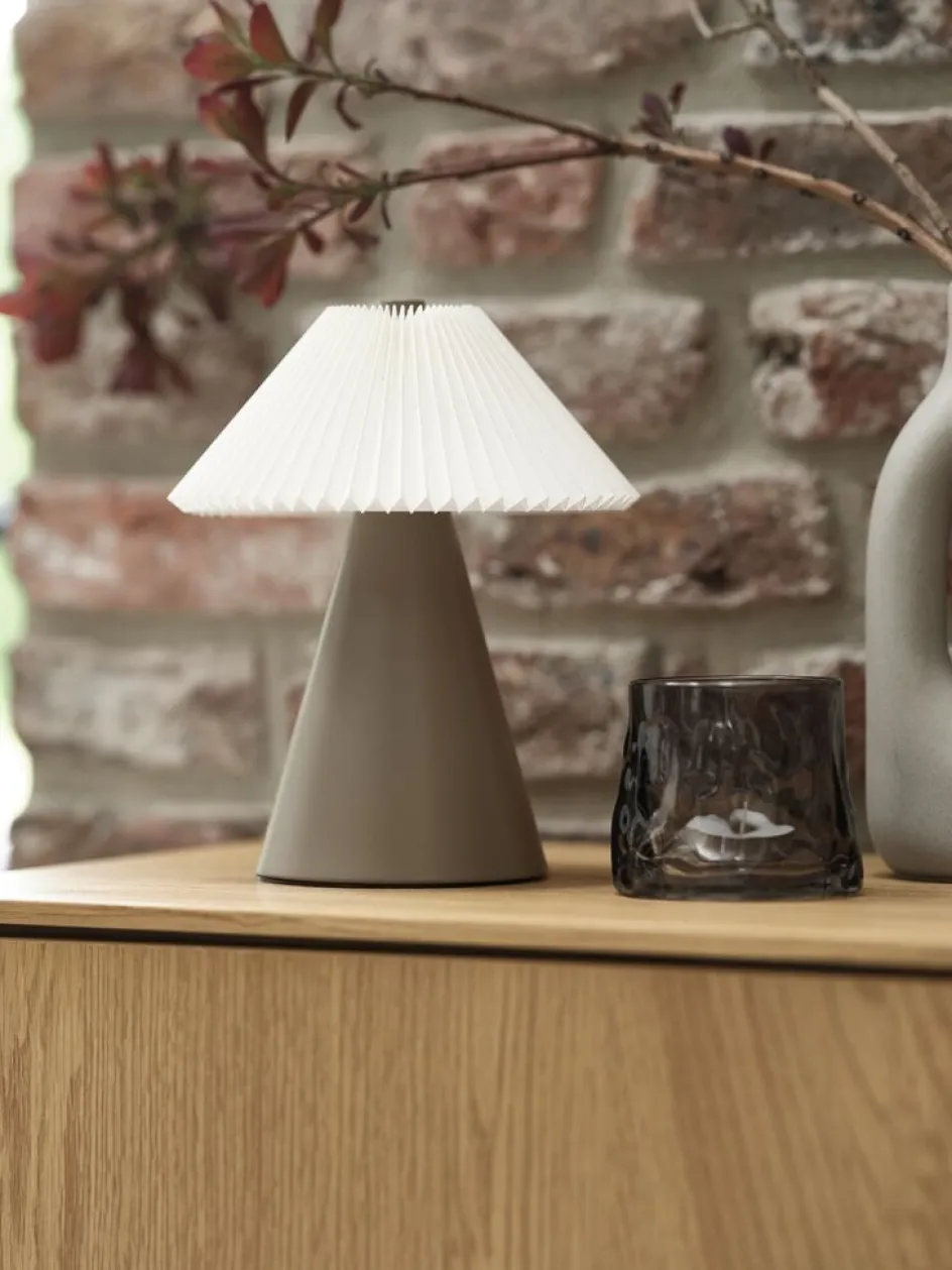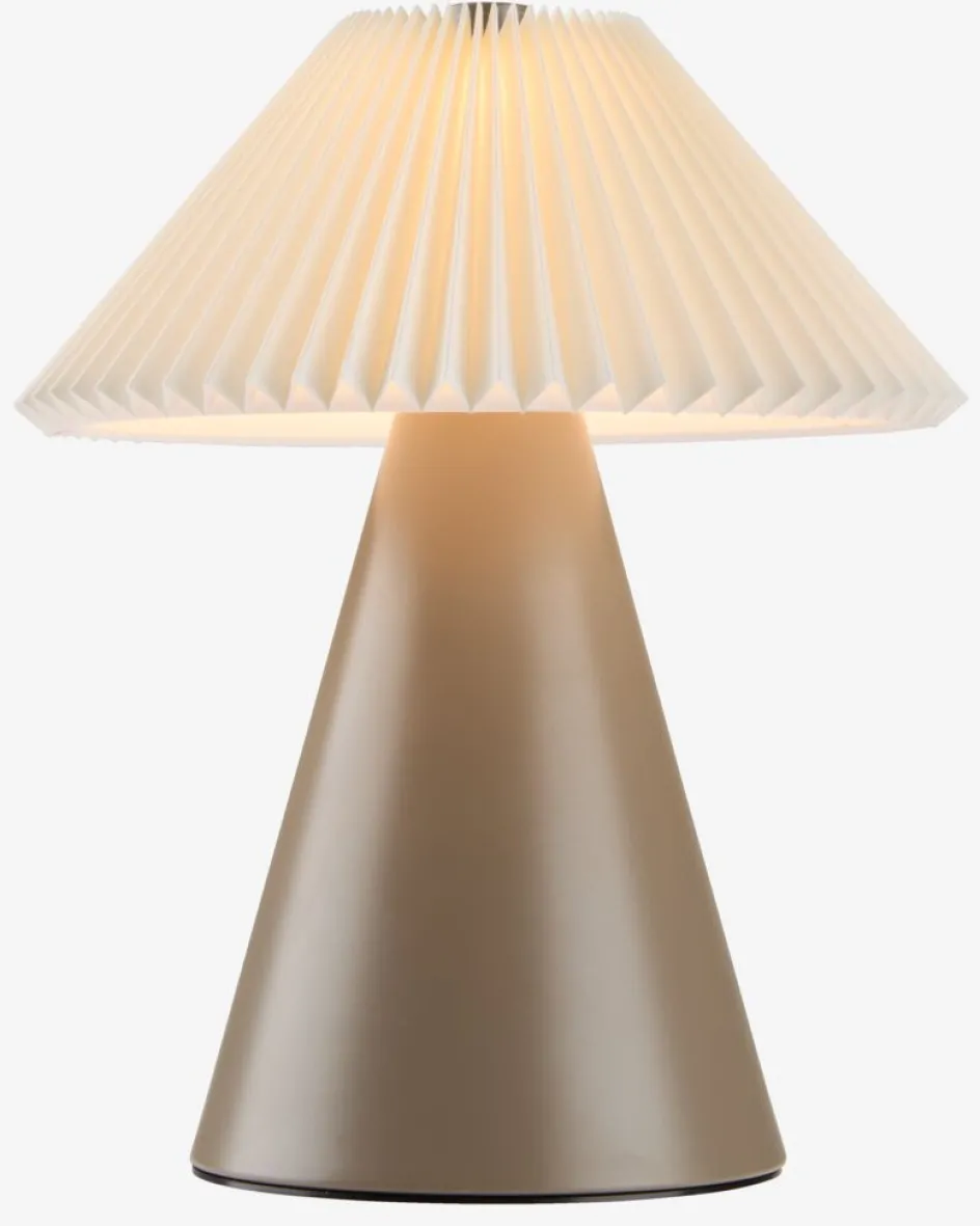 Acier et plastique. Abat-jour en tissu. Avec commande tactile, 3 niveaux de luminosité et minuterie. Excl. piles. Ø17 x H20 cm