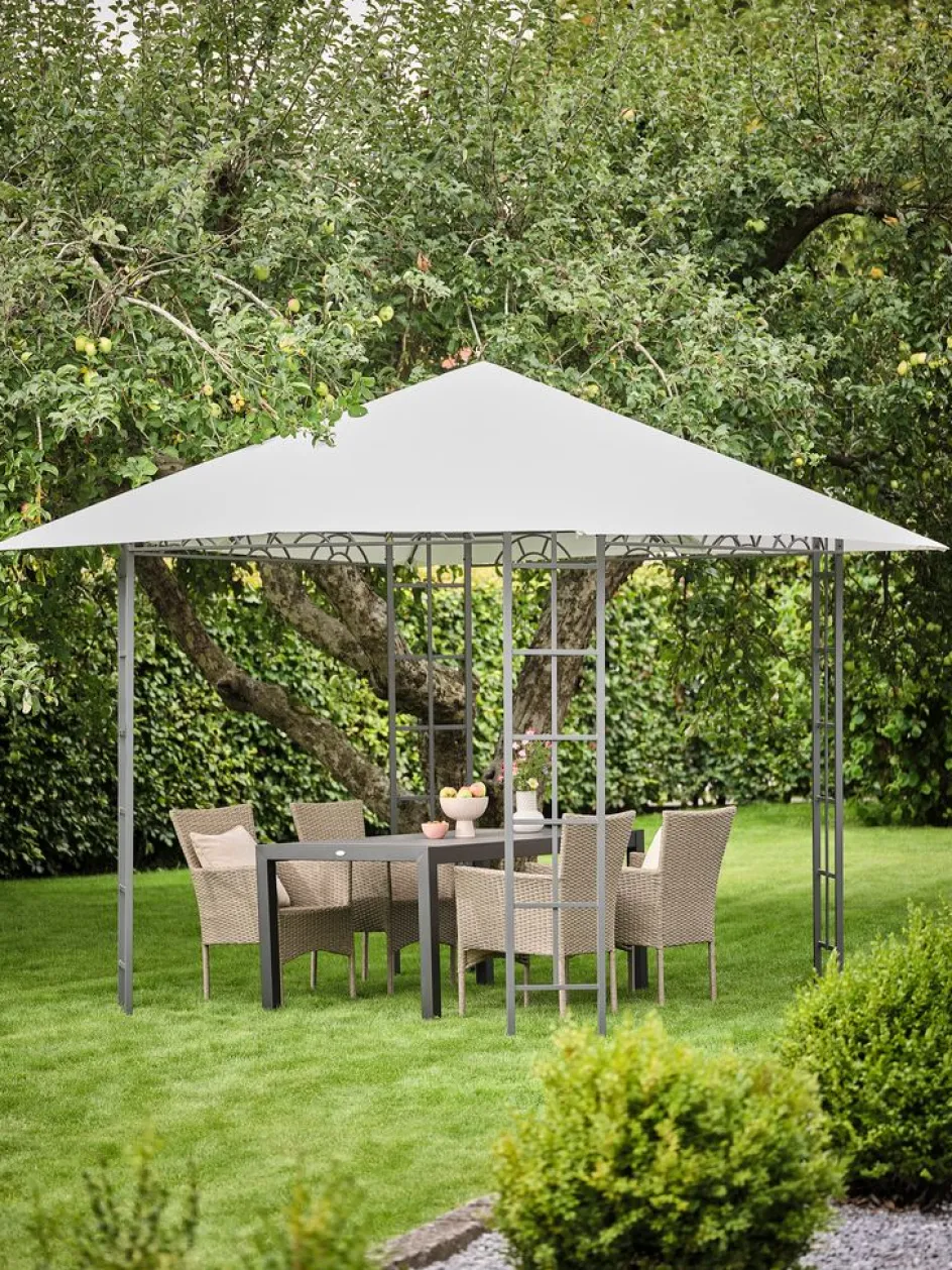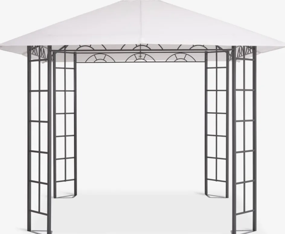 Tonnelle avec cadre en acier et auvent en polyester étanche et résistant aux UV. Charge hydrostatique 1000mm. Poids : 31kg. Panneaux latéraux disponibles séparément. l3 x L3 x H2,65 m