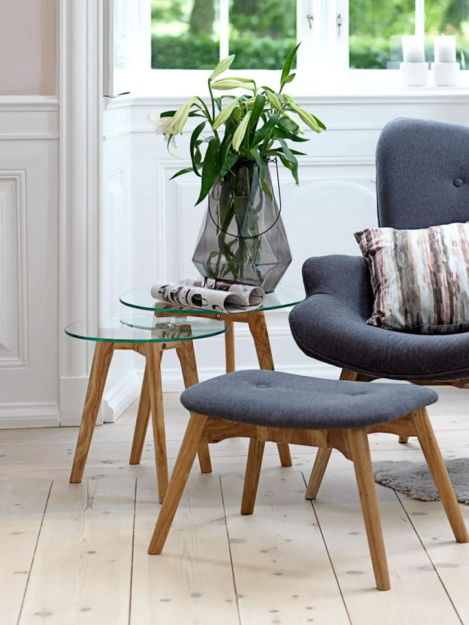 Plateau : verre trempé, aluminium. Pieds : chêne massif. Huilé. Lot de 2. Ø50/40 x H45/40 cm
