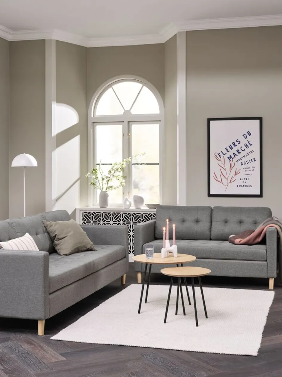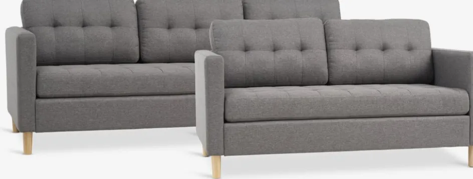 Canapés en tissu. Coussin d’assise avec ressorts ensachés et rembourrage en mousse. Coussin de dossier en mousse. Pieds en bois massif. 2 places: l150 x H78 x P84 cm. 3 places: l216 x H78 x P84 cm