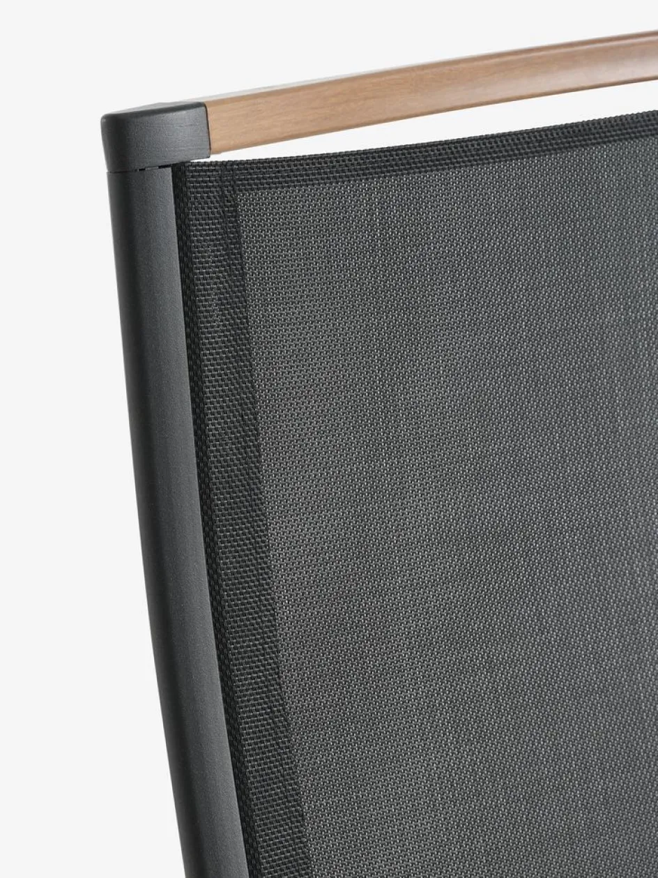 Ensemble de meubles de jardin 4 personnes. Table : aluminium et imitation bois. l100 x L220 x H74 cm. Chaise : aluminium et textilène. 6 positions. Pliable.