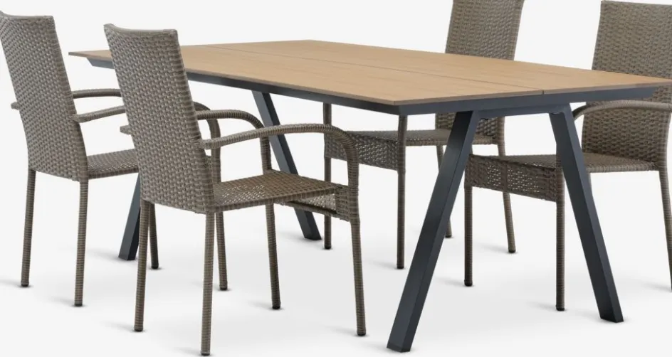 Ensemble meubles de jardin 4 places. Table: Aluminium et imitation bois. l100 x L220 x H74 cm. Chaise: Acier et polyrotin. Empilable.