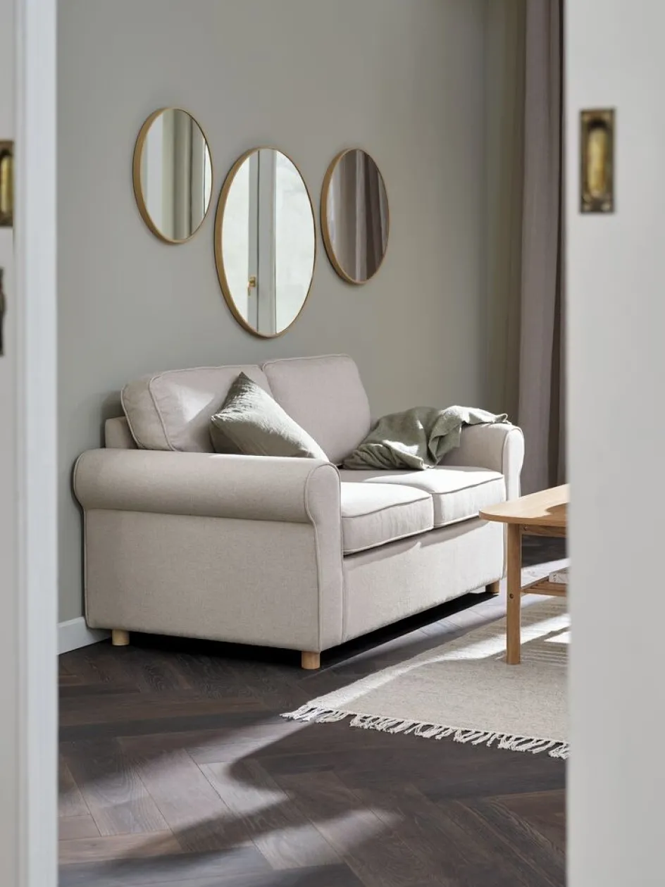 Canapé 2 places en tissu. Coussin d’assise avec ressorts ensachés et garnissage en mousse. Coussin de dossier en mousse. Pieds en bois massif. l162 x H86 x P84 cm