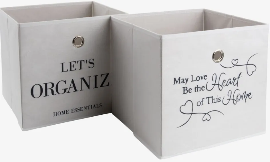 Panier blanc aux motifs assortis et avec des inscriptions. Un panier léger et spacieux qui convient à tous vos besoins de rangement. Transport facile grâce aux poignées en œillets d’acier. l32 x L28 x H30 cm