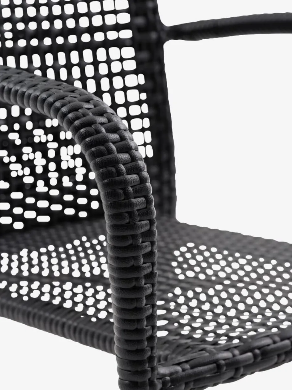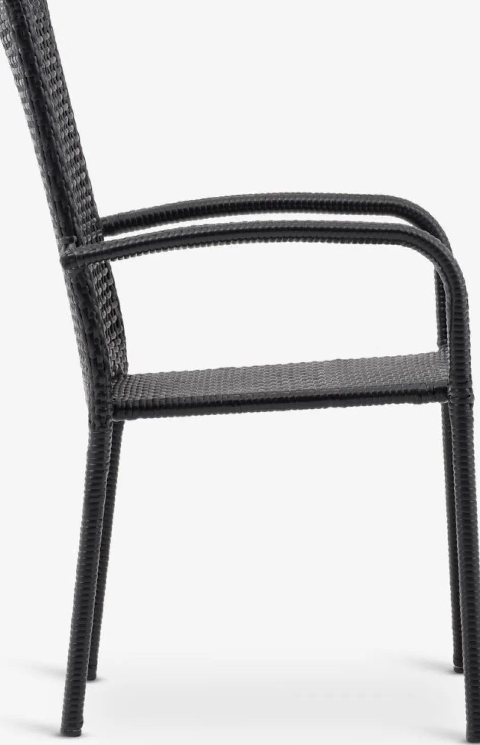 Chaise empilable noire en polyrotin avec une structure en acier peint par poudrage. Le polyrotin donne un aspect naturel à l’osier, tout en étant résistant aux intempéries et sans entretien. La chaise de jardin peut être empilée pour un rangement compact.