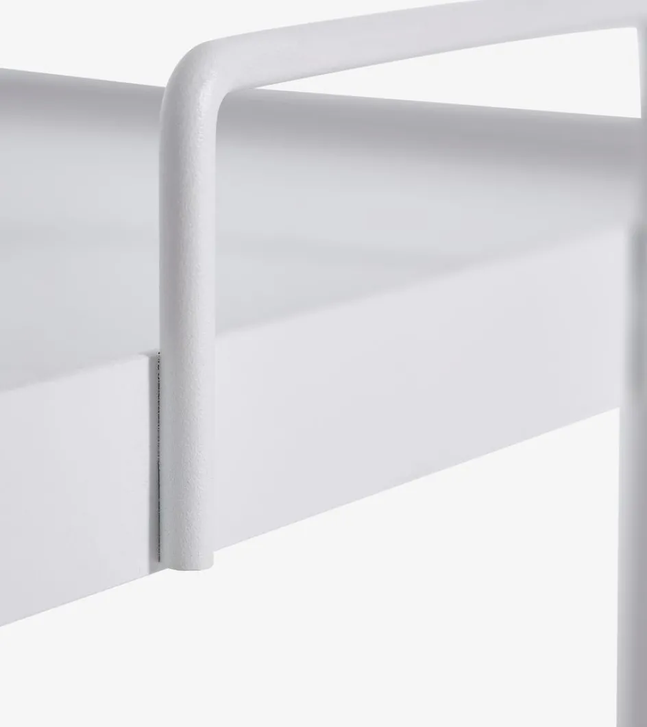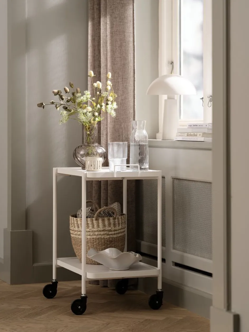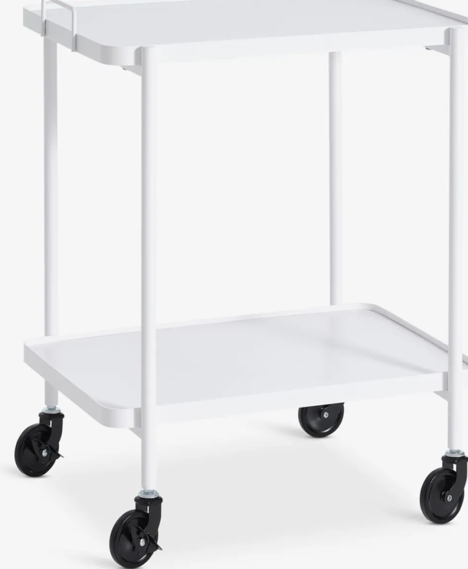 En acier. Étagère : MDF mélaminé. Roulettes : polypropylène. l56 x H70 x P41 cm