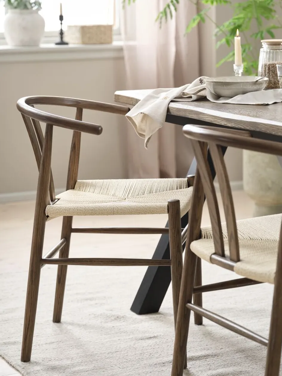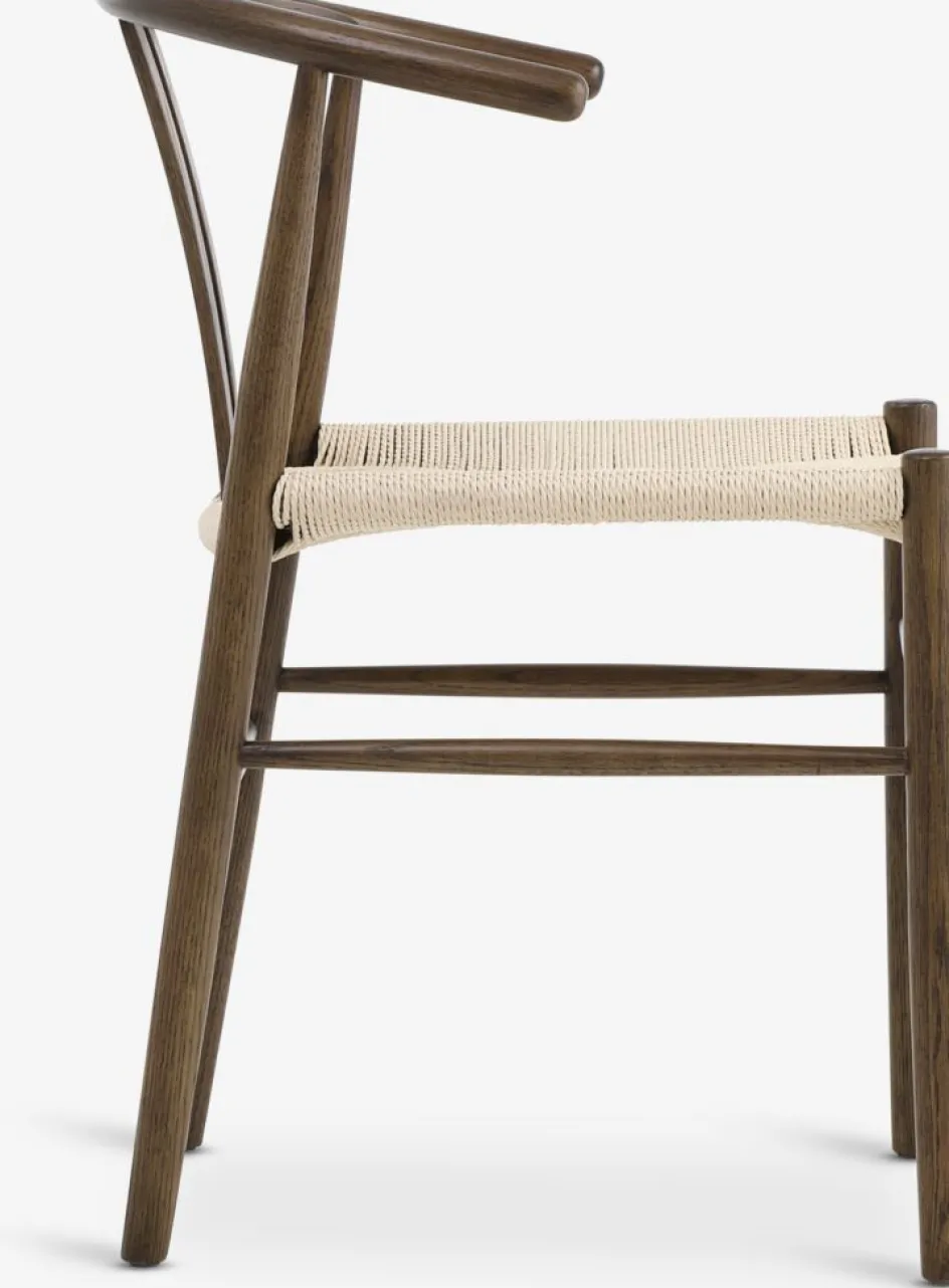 Chaise de salle à manger avec assise en corde de papier tressée. Cadre en chêne foncé massif avec dossier incurvé. Le bois est laqué pour une plus grande durabilité.