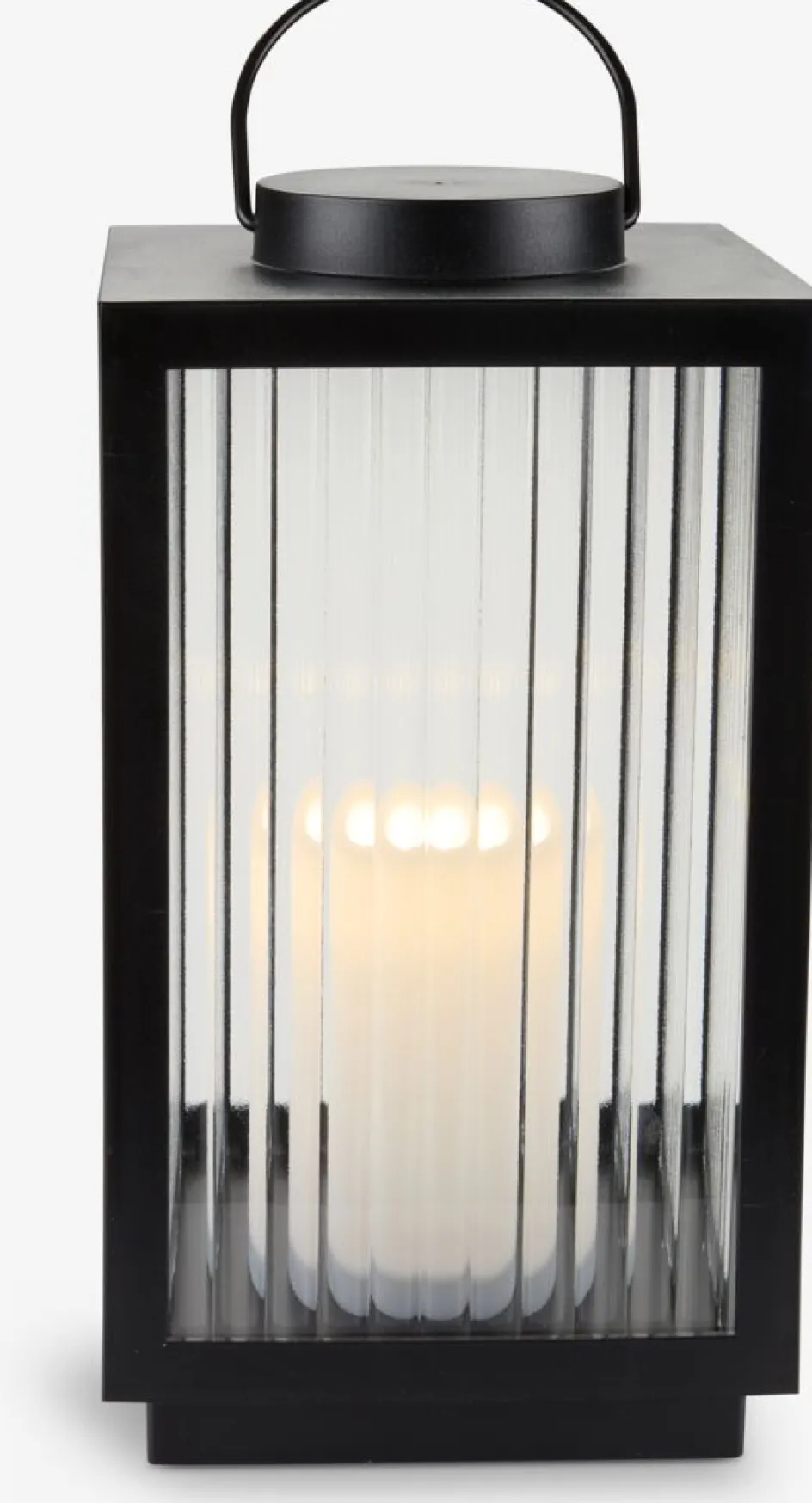 Lanterne au design noir moderne avec des panneaux en verre nervuré. La lanterne à piles est dotée d’une LED intégrée qui diffuse une lueur chaude et agréable. Elle dispose également d’une fonction de minuterie pratique pour un éclairage automatique. Nécessite 2 piles AA (non incluses). l16 x L16 x H29 cm