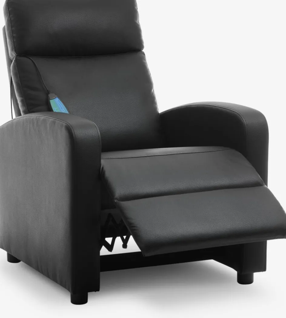 Structure : contreplaqué. Garnissage : mousse polyuréthane (20 kg/m³). Revêtement : polyuréthane. Pieds : polyamide. Fonction massage par vibrations avec 2 niveaux d’intensité et 5 types de massages. Avec mécanisme de basculement et repose-pied intégré. l75 x H73-101 x P92-160 cm