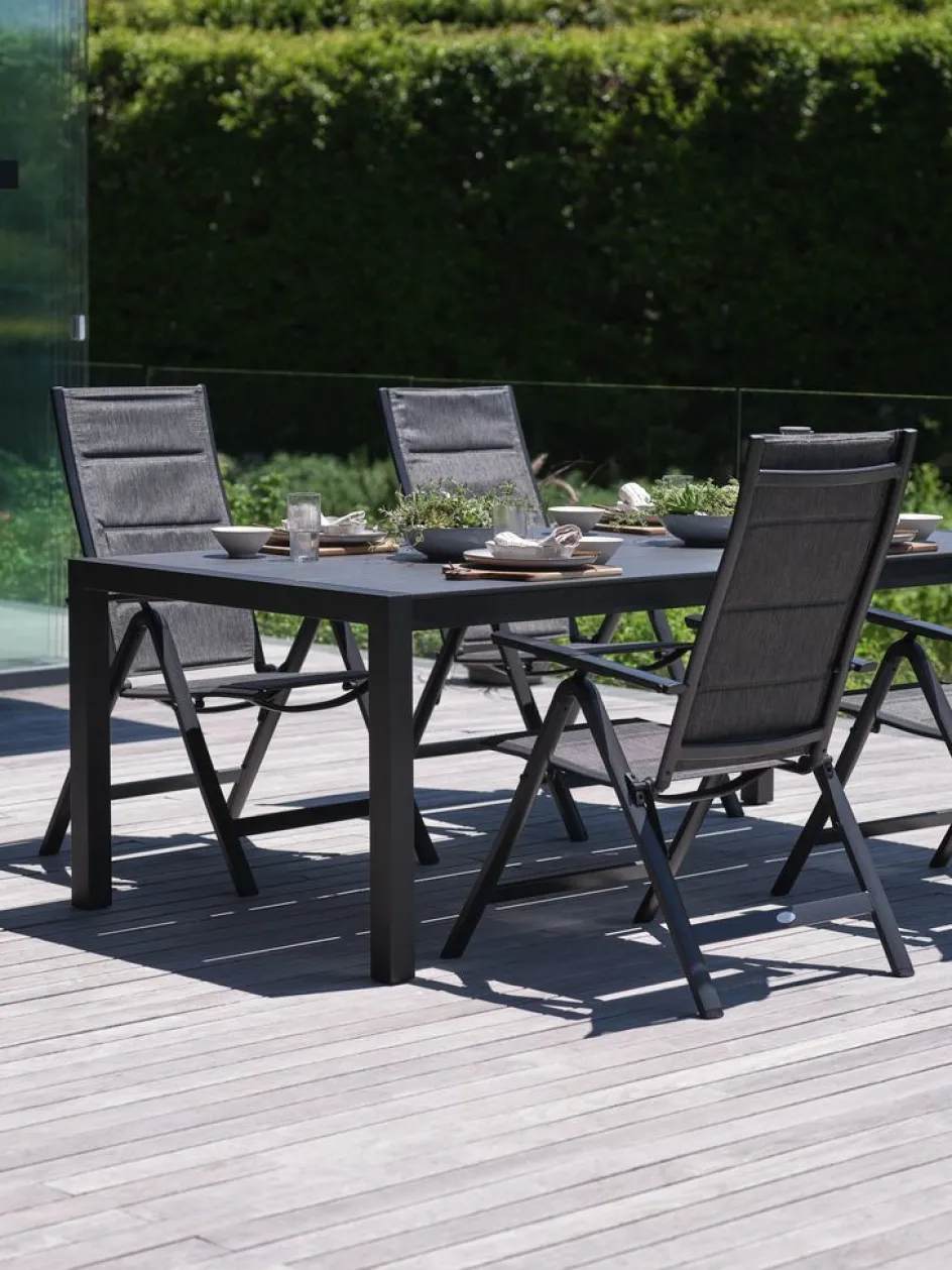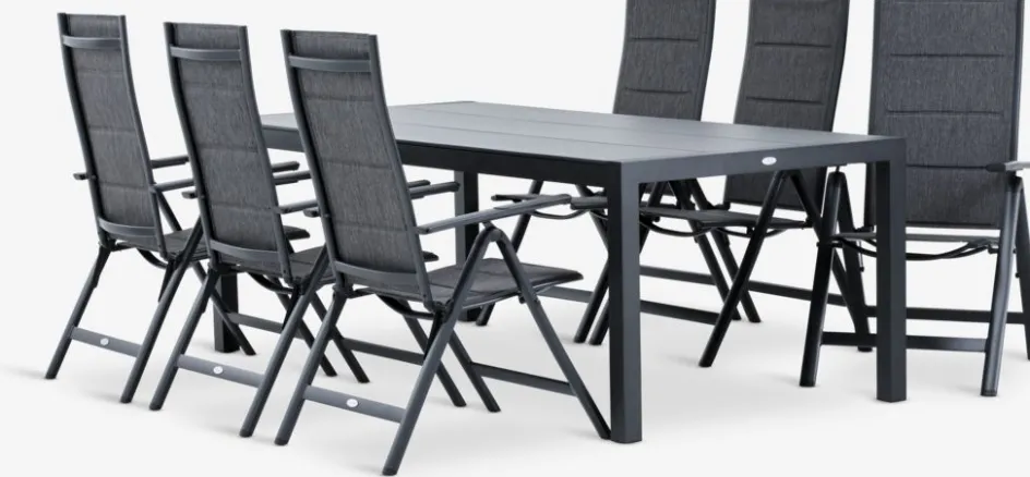 Ensemble de meubles de jardin 4 personnes. Table : aluminium et bois composite DURAWOOD®. Le DURAWOOD® est un matériau composite durable est fabriqué à partir de fibres de bois FSC® et de plastique. l100 x L214 x H74 cm. Chaise : aluminium, textilène et rembourrage en mousse à séchage rapide. Pliable.