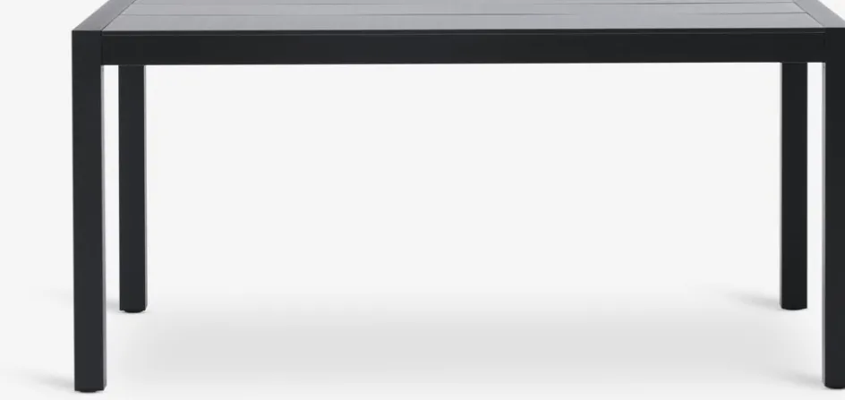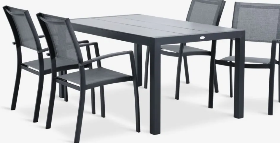 Ensemble meubles de jardin 4 personnes. Table : aluminium et bois composite DURAWOOD®. Le DURAWOOD® est un matériau composite durable composé de fibres de bois dur FSC® et de plastique. l92 x L160 x H74 cm. Chaise : aluminium et textilène. Empilable.
