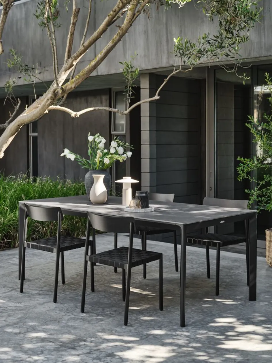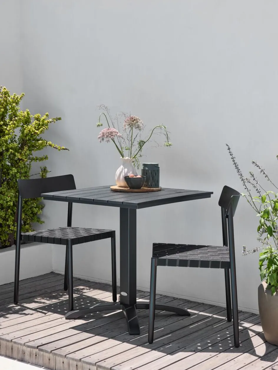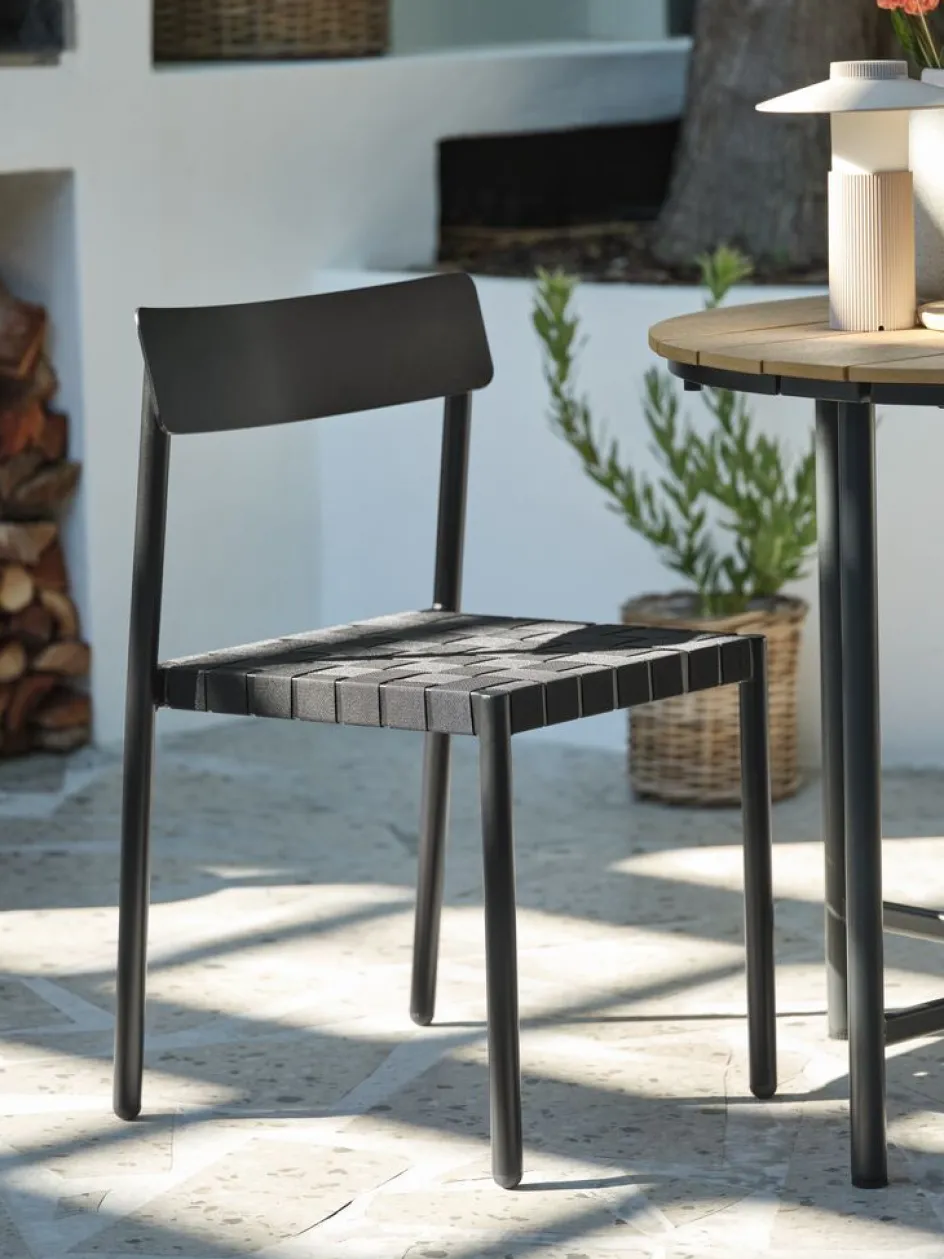 Chaise empilable noire avec assise en polyester tissé et structure en aluminium peint par poudrage. L’aluminium est un matériau léger et robuste qui ne rouille pas. La chaise de jardin peut être empilée pour un rangement compact.