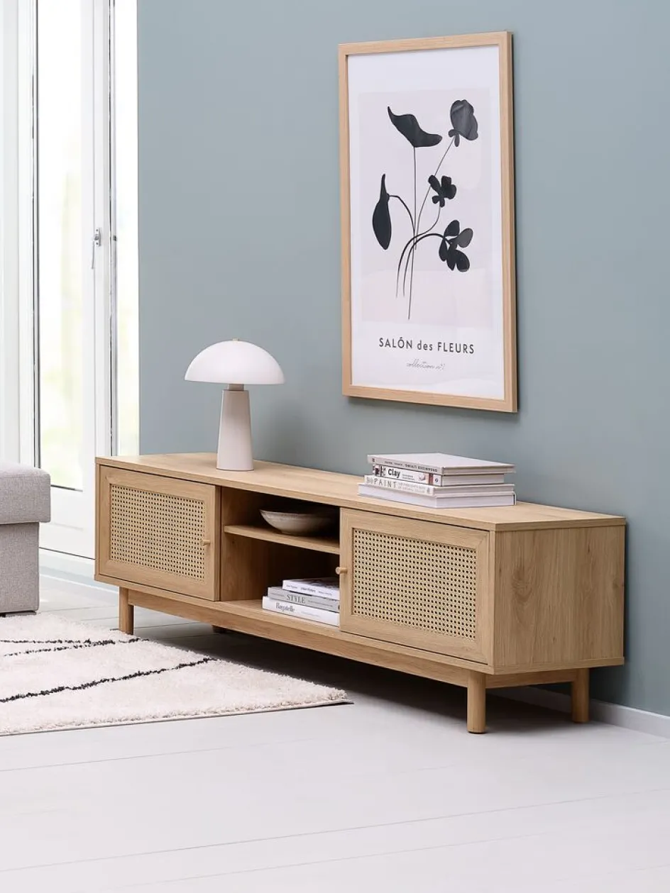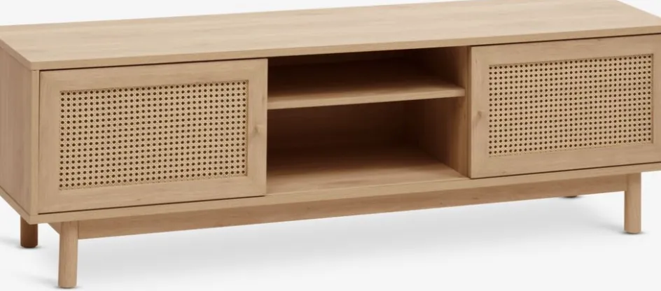 Bois massif, polyrotin et placage décoratif. Avec portes coulissantes. l160 x H50 x P40 cm