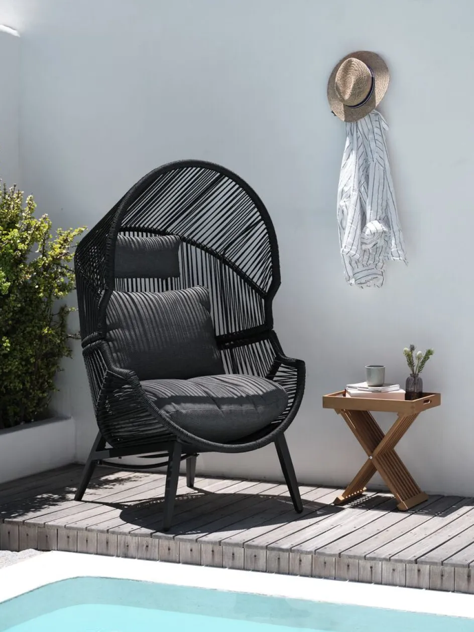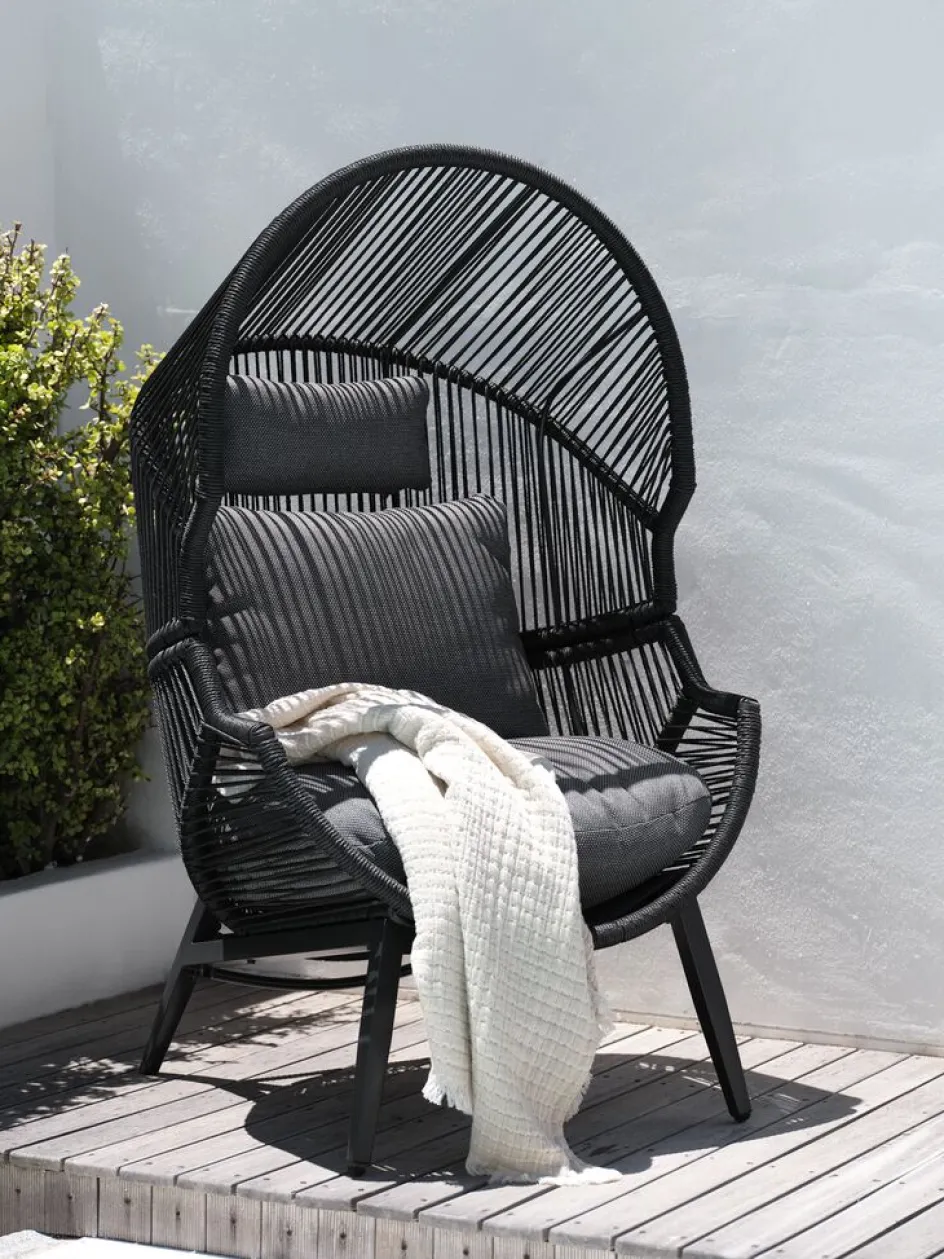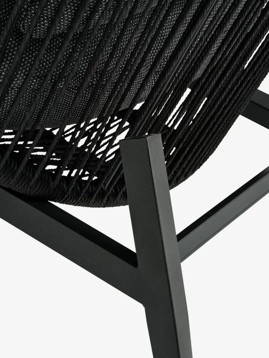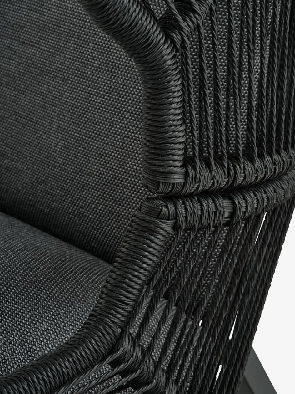 Fauteuil lounge en acier et polyrotin. Incl. coussins haut de gamme avec housse résistante tissée. l85 x H143 x P88