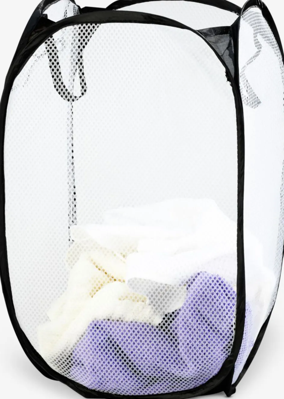 Panier à linge avec un cadre en acier et un maillage en polyester qui permet aux vêtements de respirer. Il est facile à déplacer grâce à sa structure légère et aux poignées. Le panier peut être plié lorsqu’il n’est pas utilisé. l36 x L36 x H59 cm