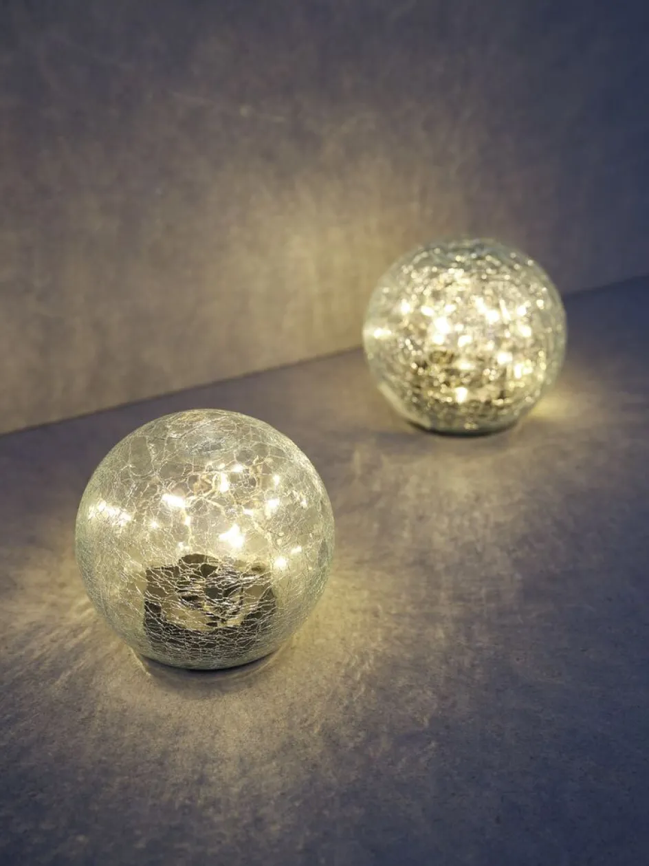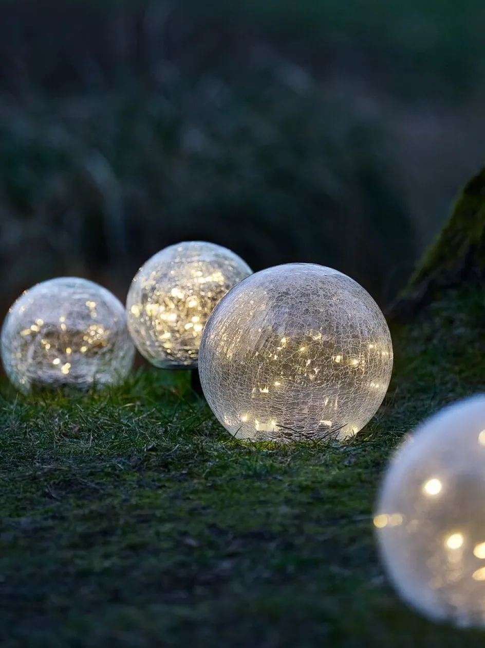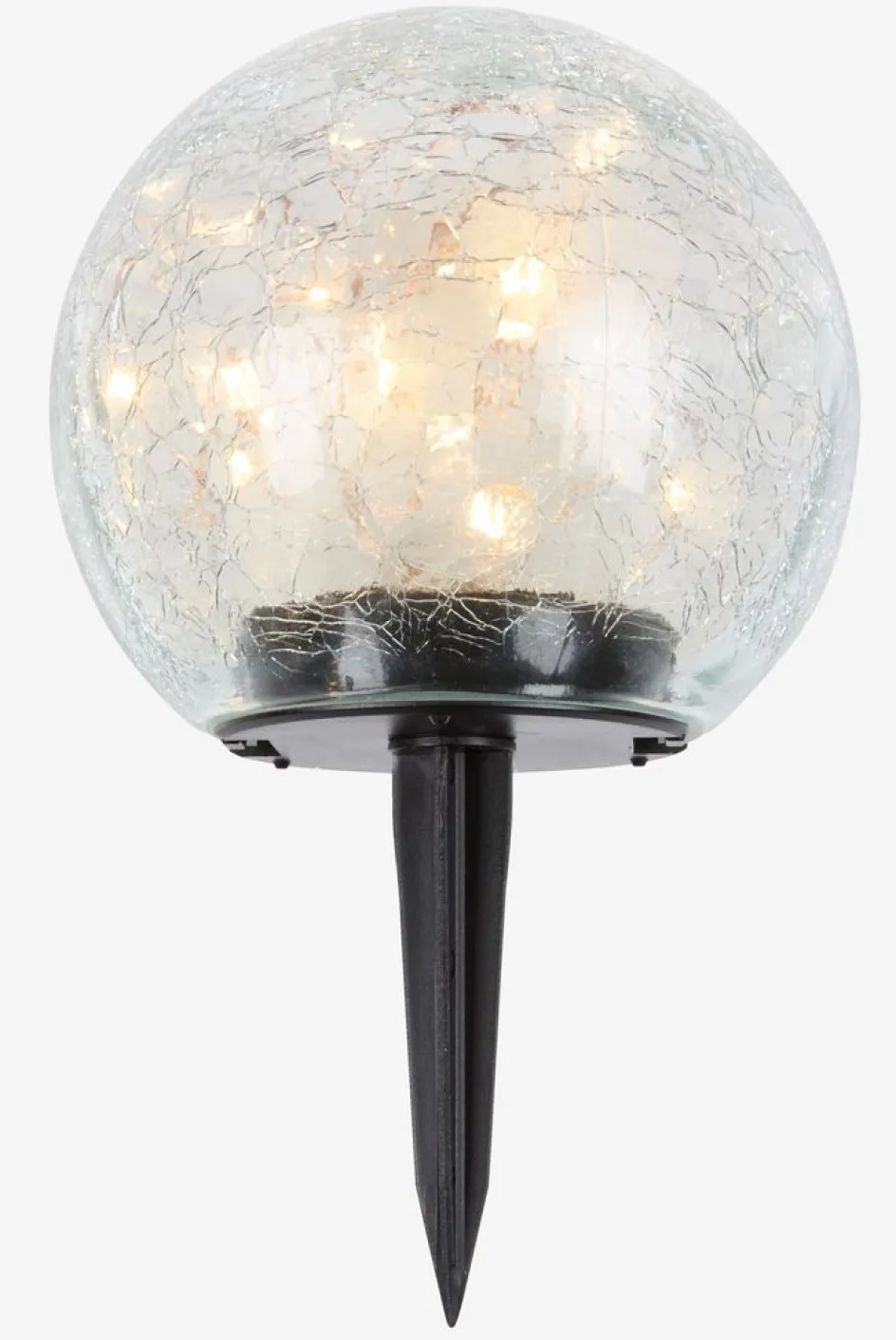 Lampe solaire avec boule en verre clair à l’aspect verre taillé. Pendant la journée, le panneau solaire intégré recharge la batterie et au crépuscule, la lampe s’allume automatiquement. La lampe est placée sur un support pointu, qui peut être facilement planté dans le sol. Ø15 x H25 cm