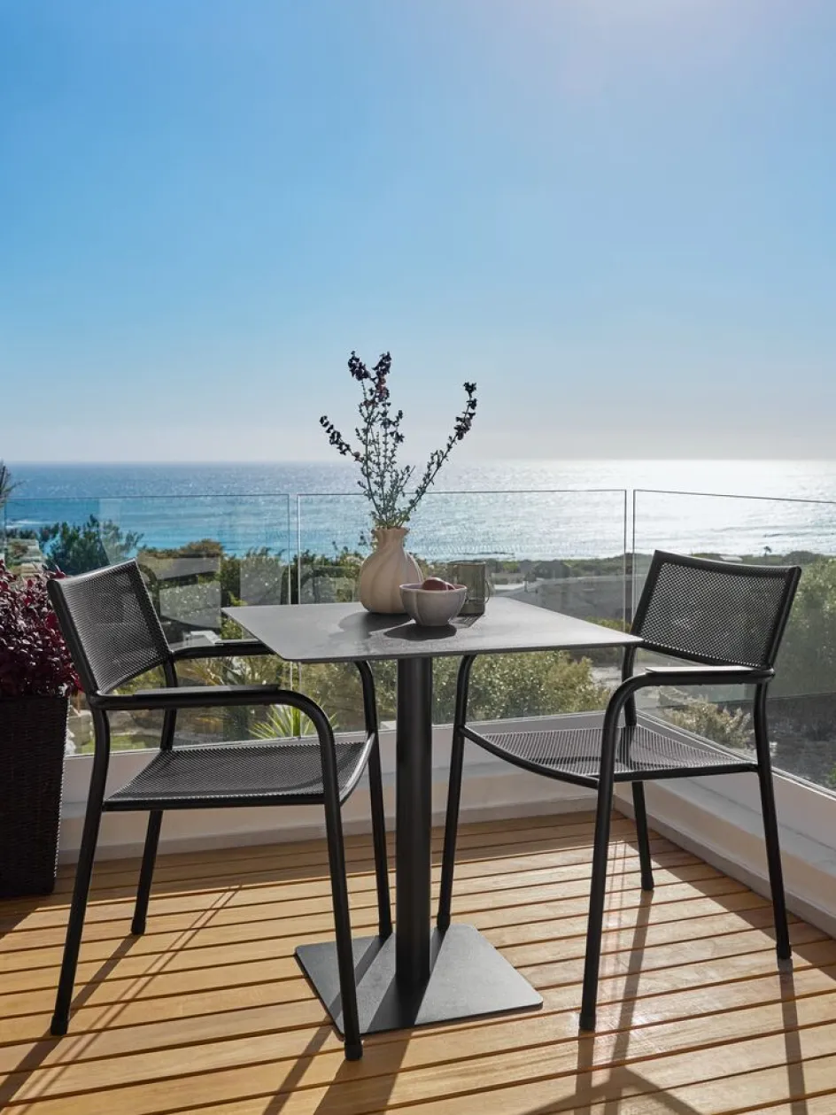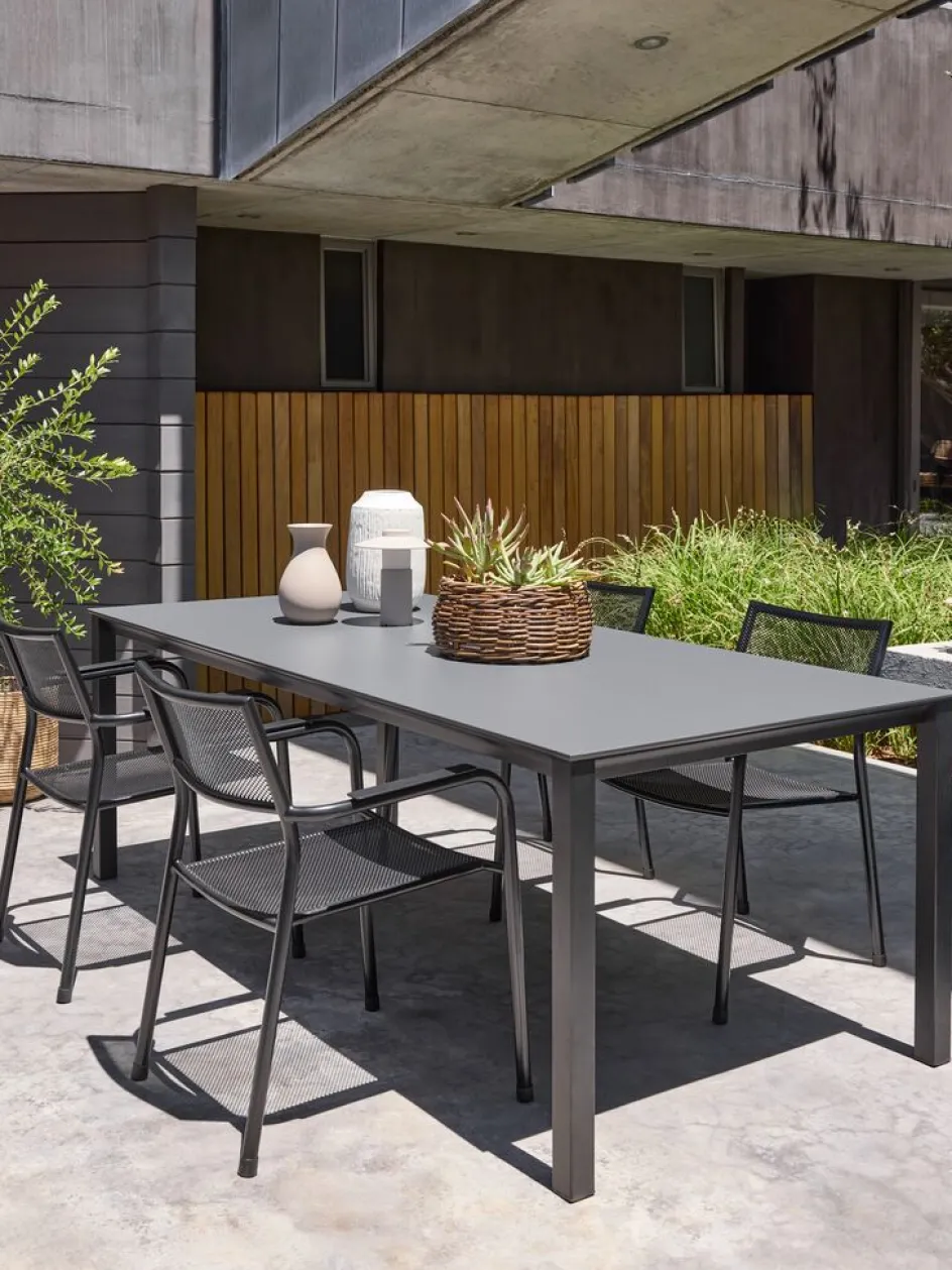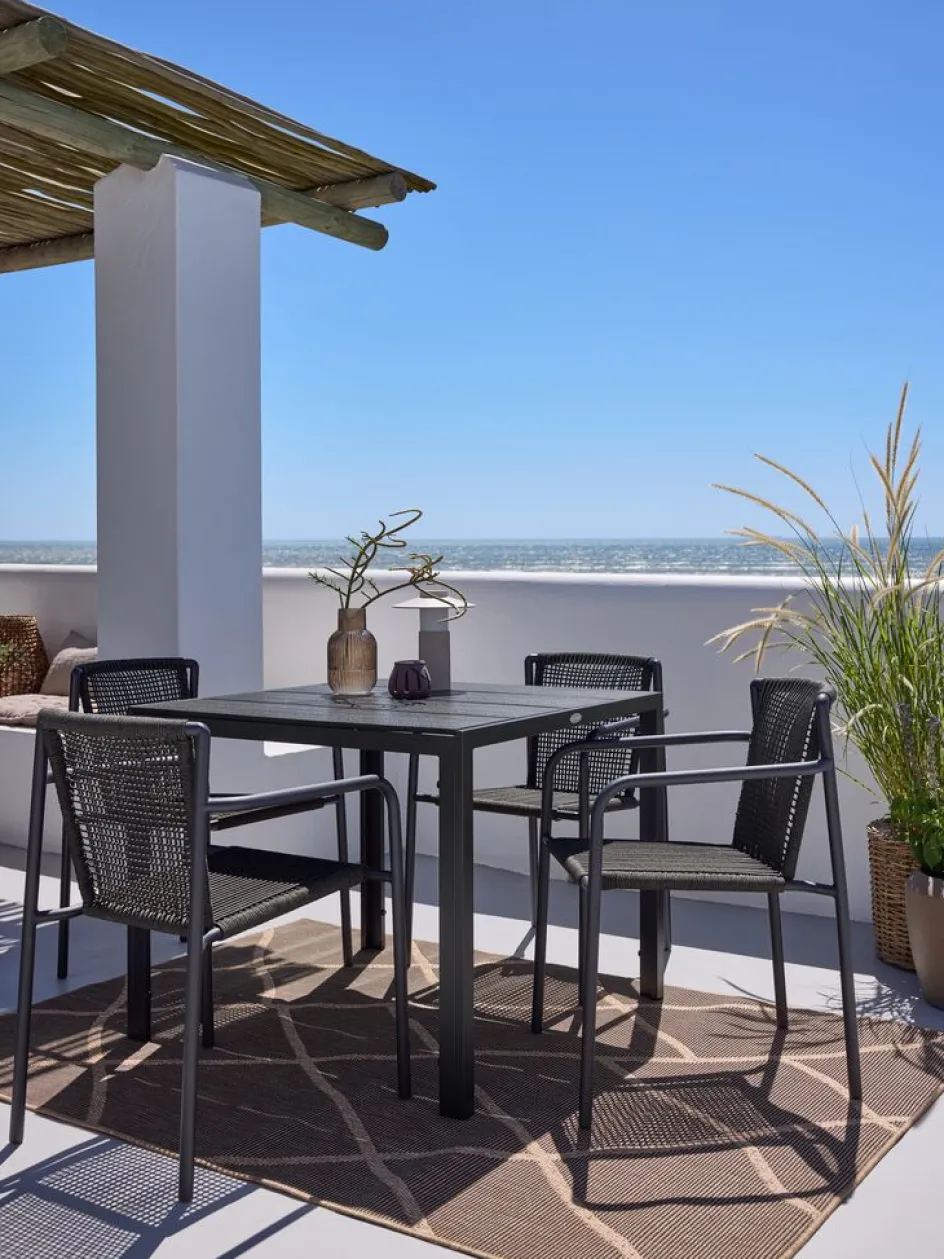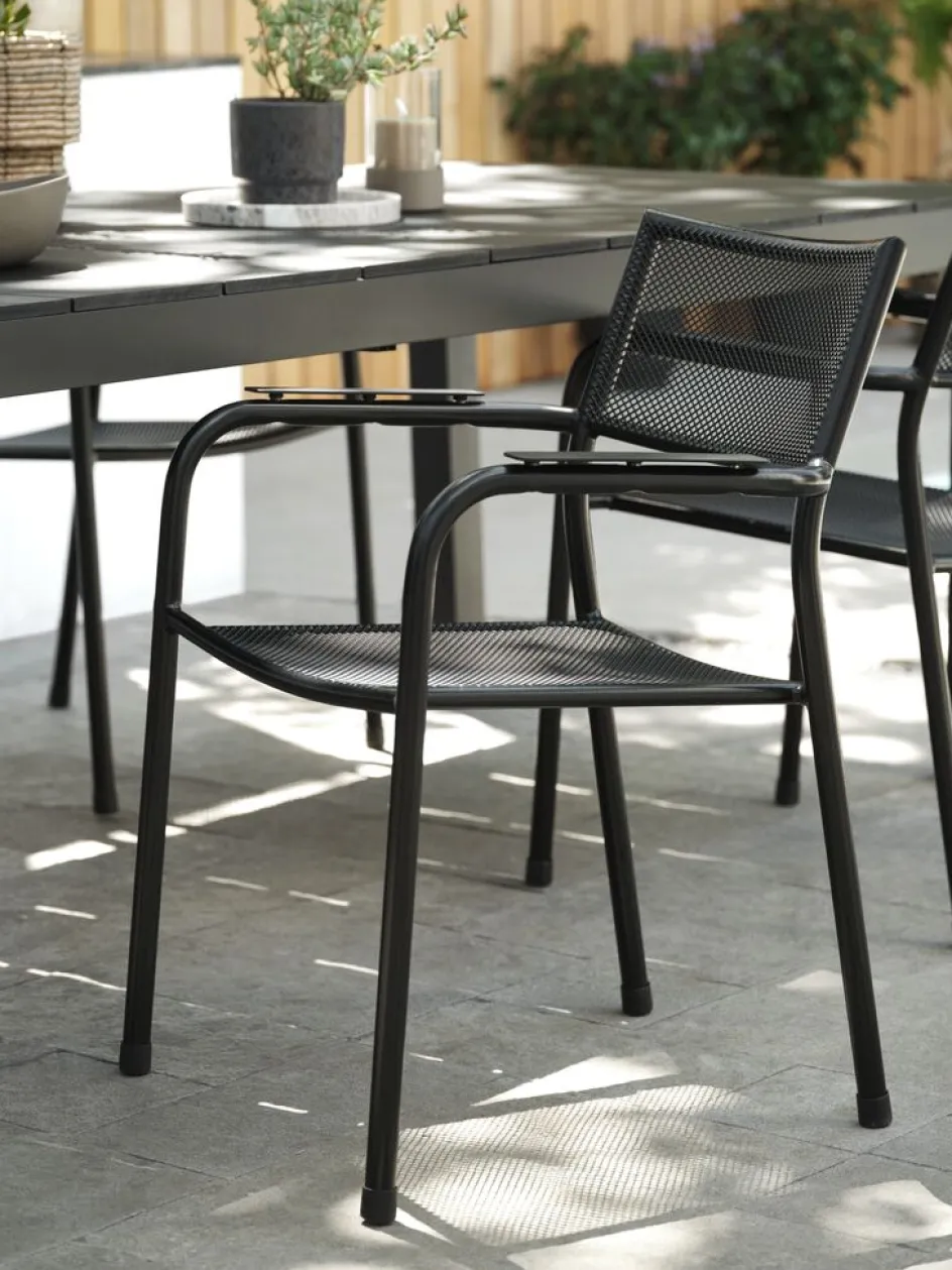 Chaise empilable noire avec assise et dossier en acier maillé et structure en acier. L’acier est traité avec un revêtement antirouille Durasint®. La chaise de jardin peut être empilée pour un rangement compact.