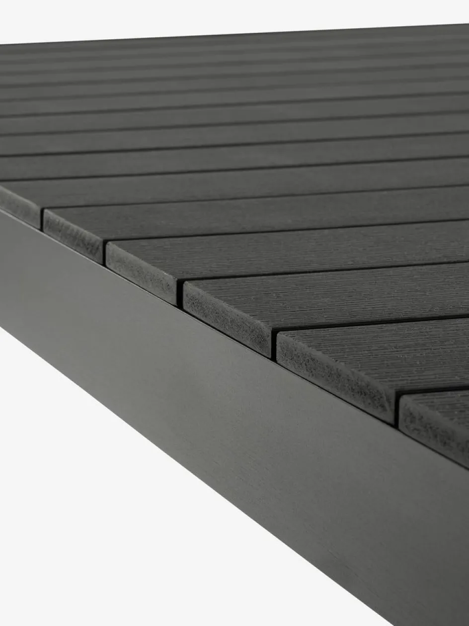 Ensemble meubles de jardin 4 places. Table: Aluminium et imitation bois. Incl. 1 rallonge pouvant être rangée sous le plateau. l95 x L205/275 x H76 cm. Chaise: Aluminium et polypropylène. Empilable.