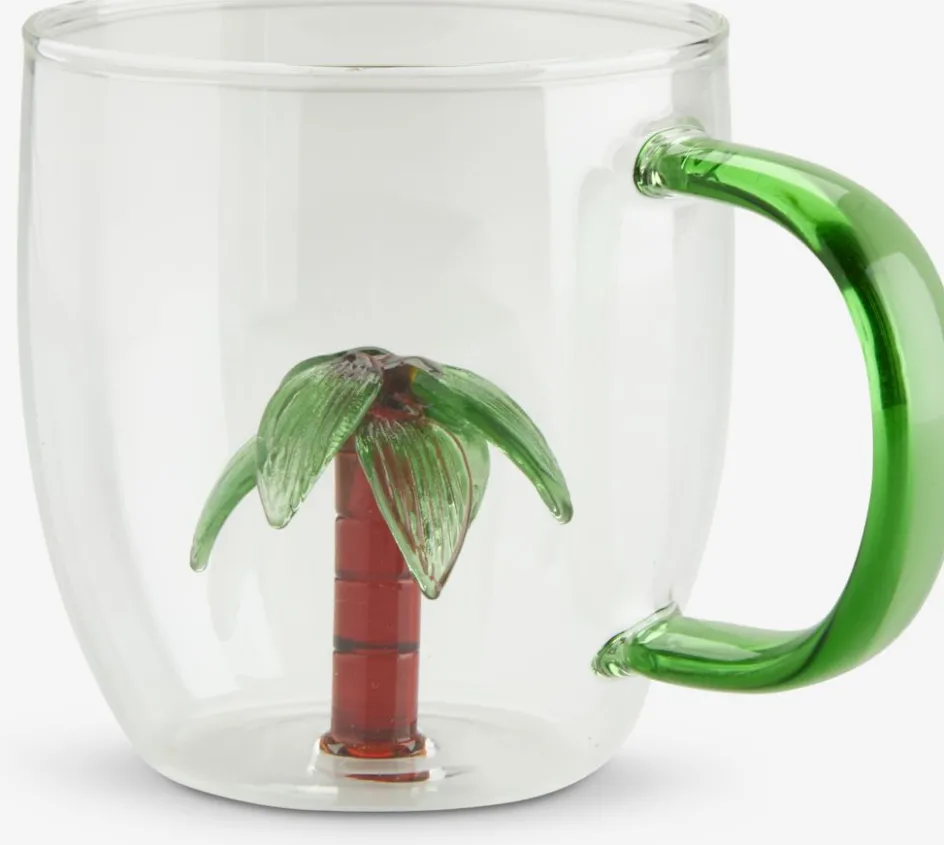 Tasse en verre avec un palmier à l’intérieur, qui semble grandir au fur et à mesure que la tasse se remplit. La tasse est en verre borosilicate, qui résiste à la chaleur et est très durable. 32 cl. Ø8 x H9 cm
