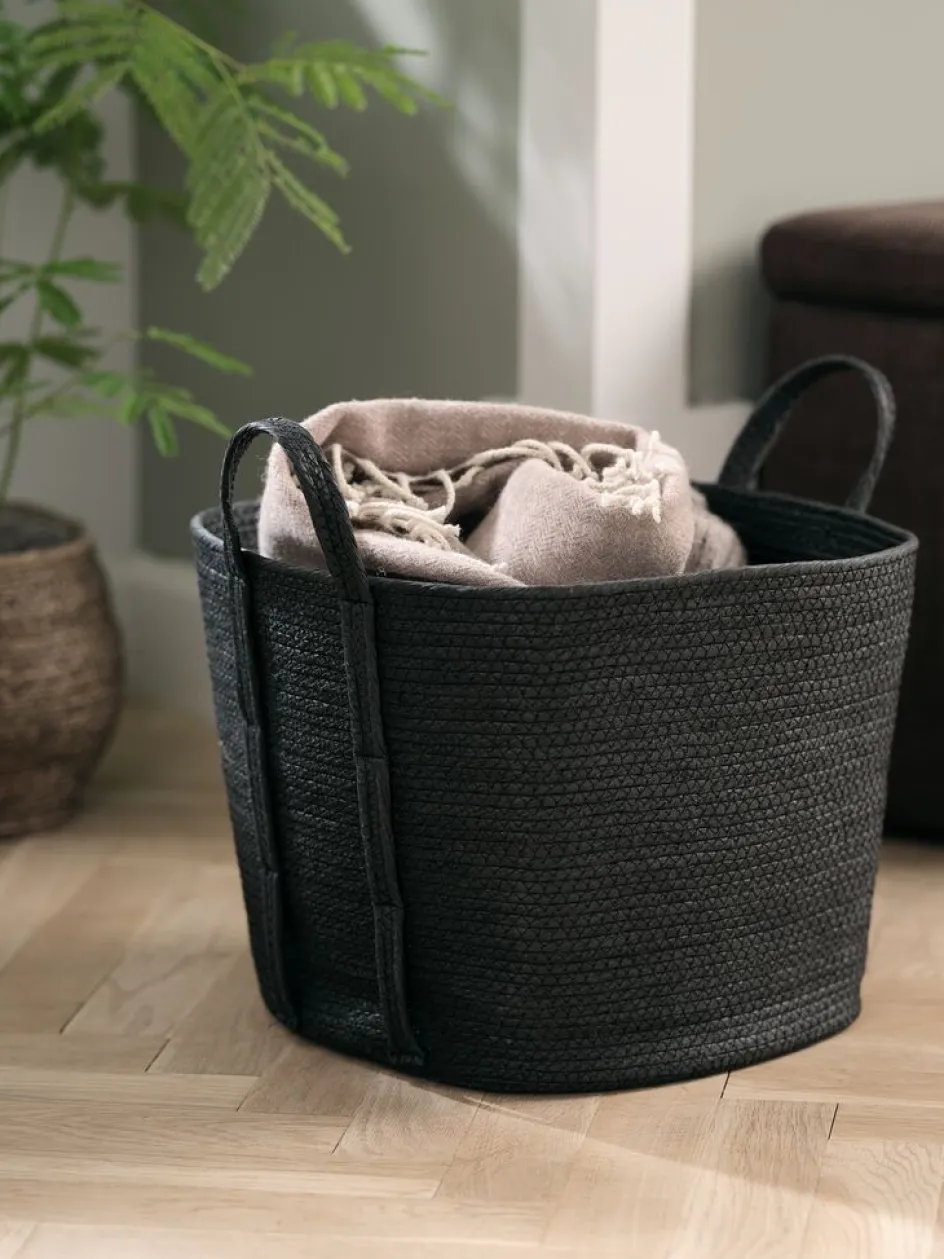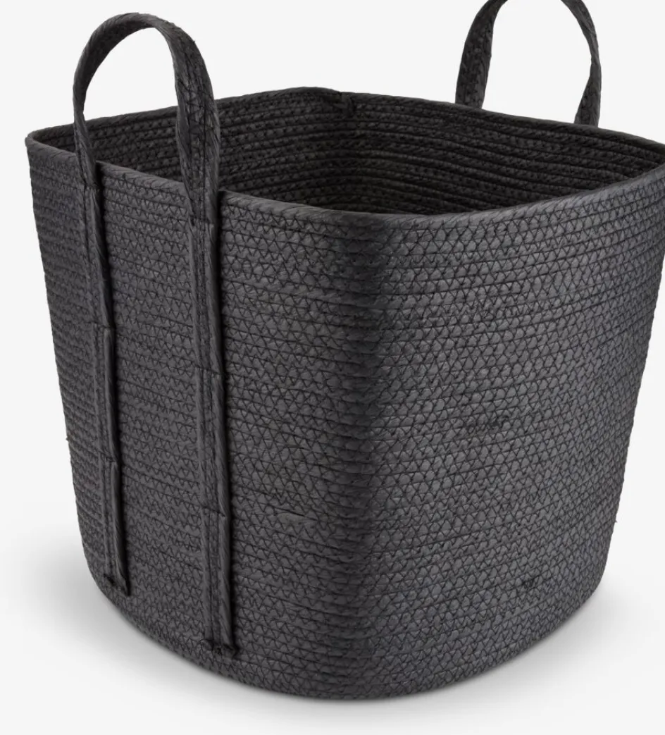 Panier noir en fil de papier, idéal pour ranger des couvertures, des jouets et plus encore dans les salons ou les salles de bains. Équipé de poignées pratiques. l37 x L37 x H32 cm