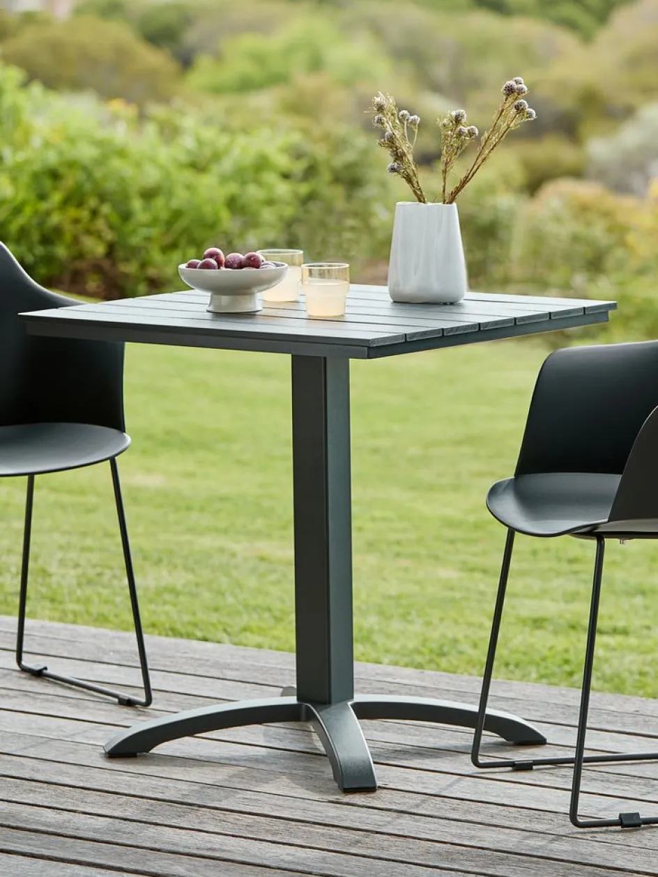 Table de bistrot noire avec un plateau en imitation bois et une base en aluminium peint par poudrage. L’imitation bois a l’apparence et la texture du bois naturel sans nécessiter d’entretien. L’aluminium est un matériau léger et robuste qui ne rouille pas. l70 x L70 x H73 cm