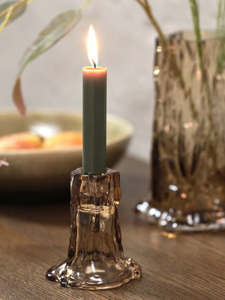 Bougie pour chandelier coloris olive foncé à la forme hexagonale singulière. Chaque bougie offre une durée d’éclairage d’environ 9 heures. Lot de 4. Ø2 x H20 cm