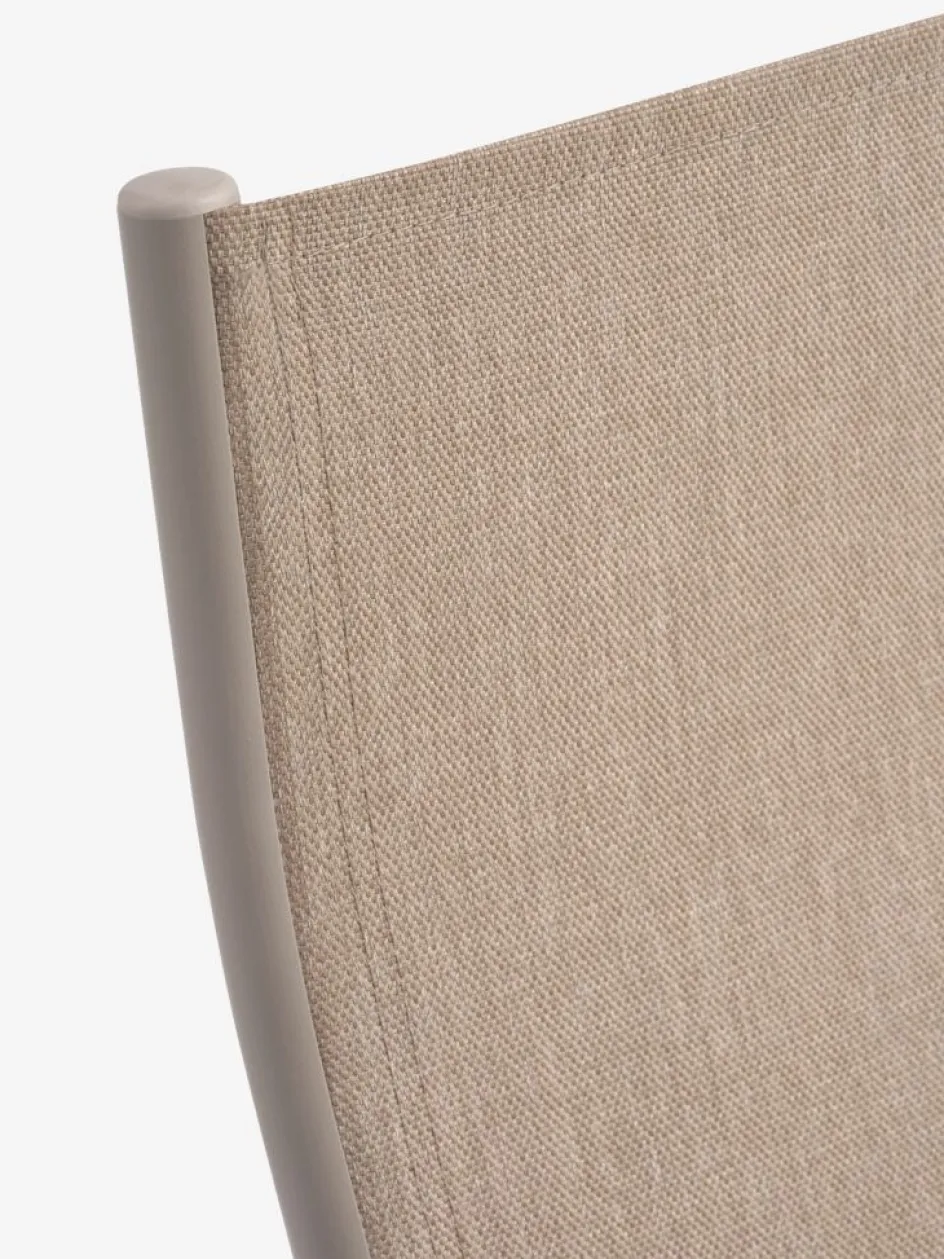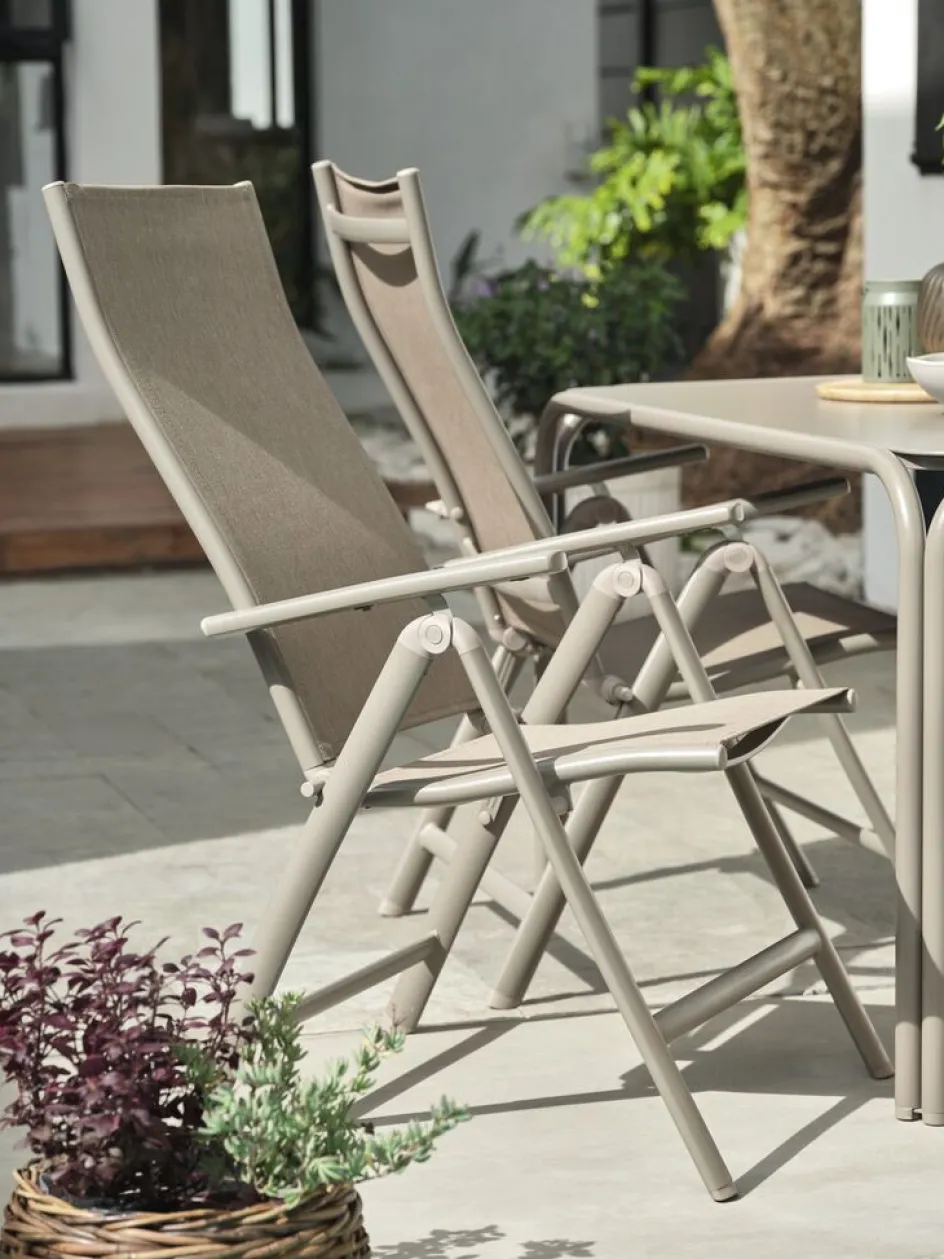 Chaise inclinable coloris sable foncé avec assise et dossier en textilène et structure en aluminium peint par poudrage. Le dossier peut être incliné en 7 positions. Le textilène est un matériau confortable résistant à la décoloration qui sèche rapidement et est facile à nettoyer. L’aluminium est un matériau léger et robuste qui ne rouille pas. La chaise de jardin peut être pliée à plat pour la transporter et la ranger facilement.